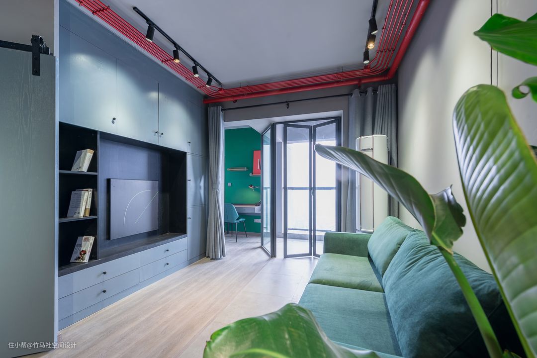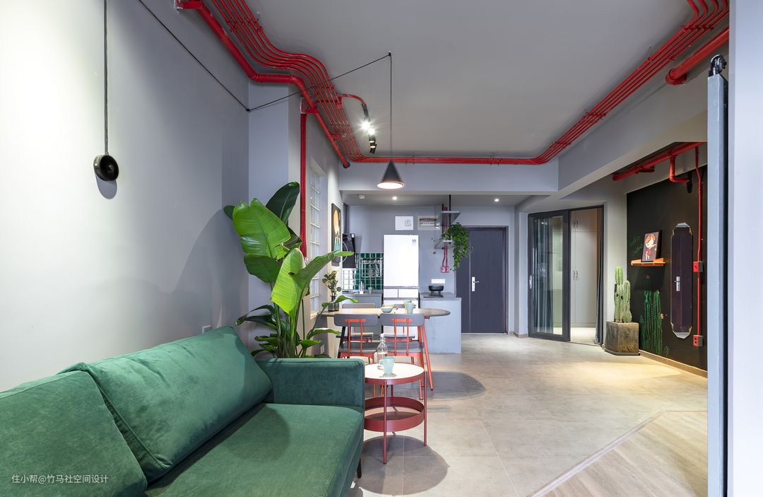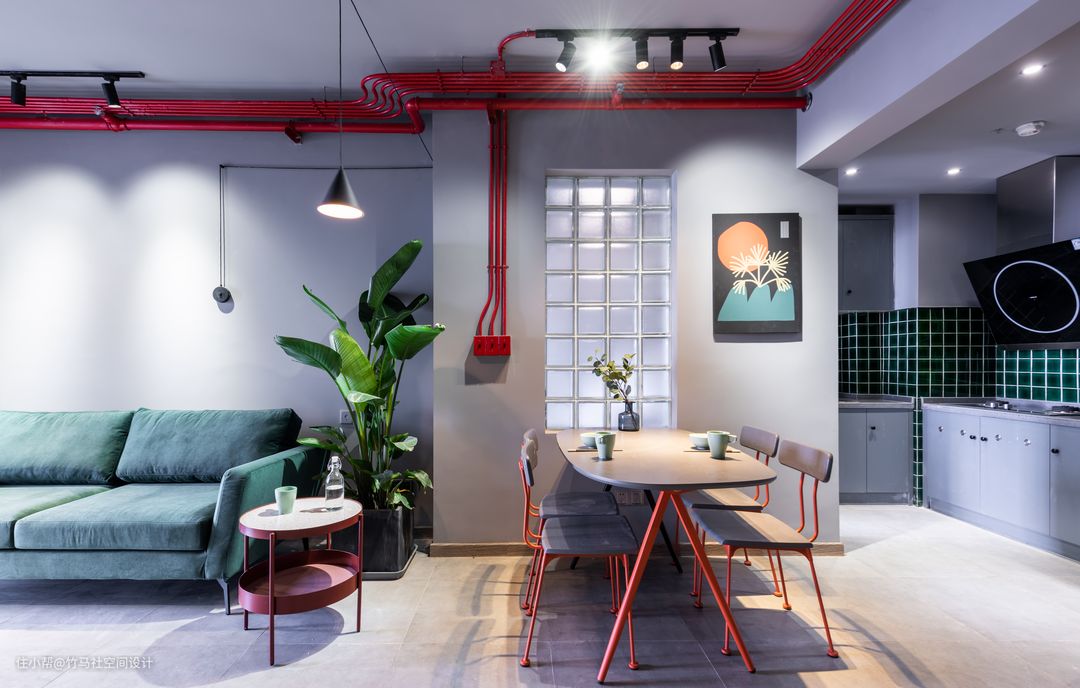 红色的线管搭配红色的工业明装开关,红色钢管组合家具,黑色线条感的吊灯和墨绿色的沙发,使整体空间的色彩一下明亮了起来。