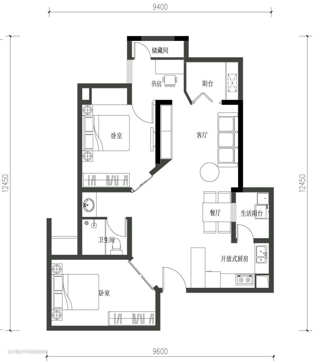 2. 尽端左边的书房需要通过阳台才能到达,后期使用很不方便。