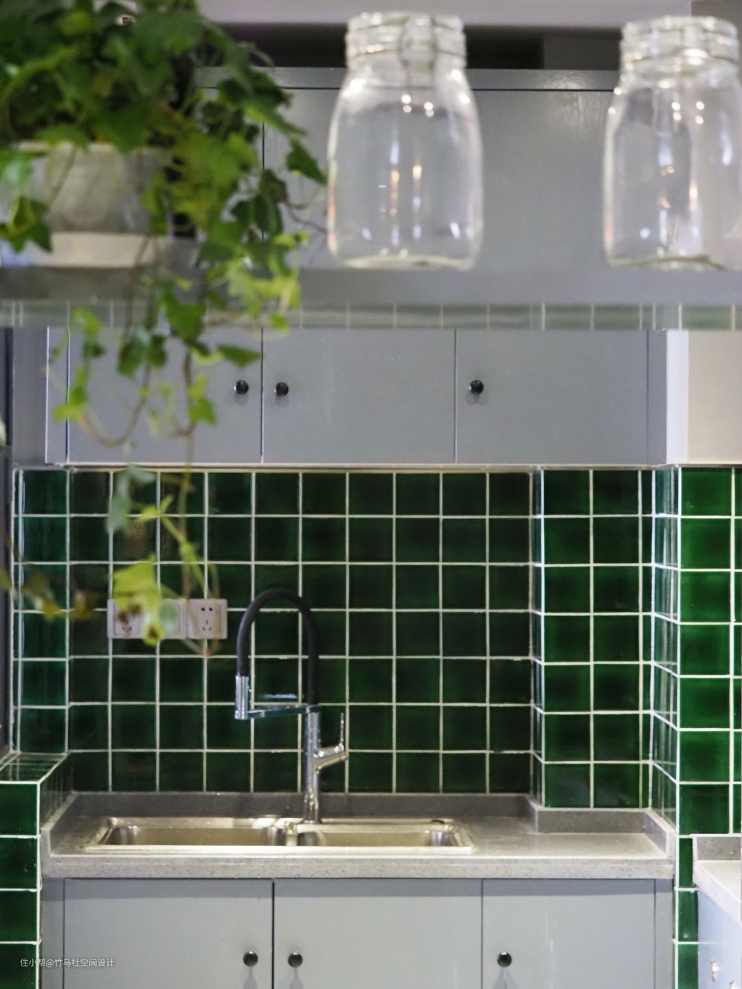 厨房使用了墨绿色的复古小方砖,和餐厅里的红色的工业线管形成了有趣的对比。