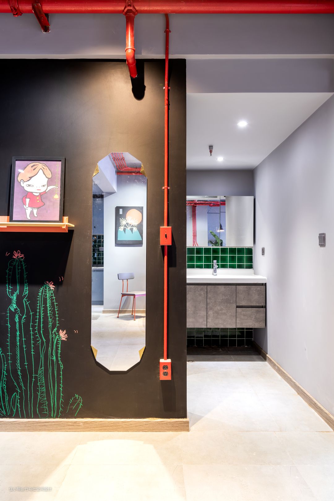 竹马社将现有平面进行了重新布局,并提出一个有趣的想法——将现有的消防管道和室内明装线管结合起来,把裸露的红色管道作为室内装饰的一部分。