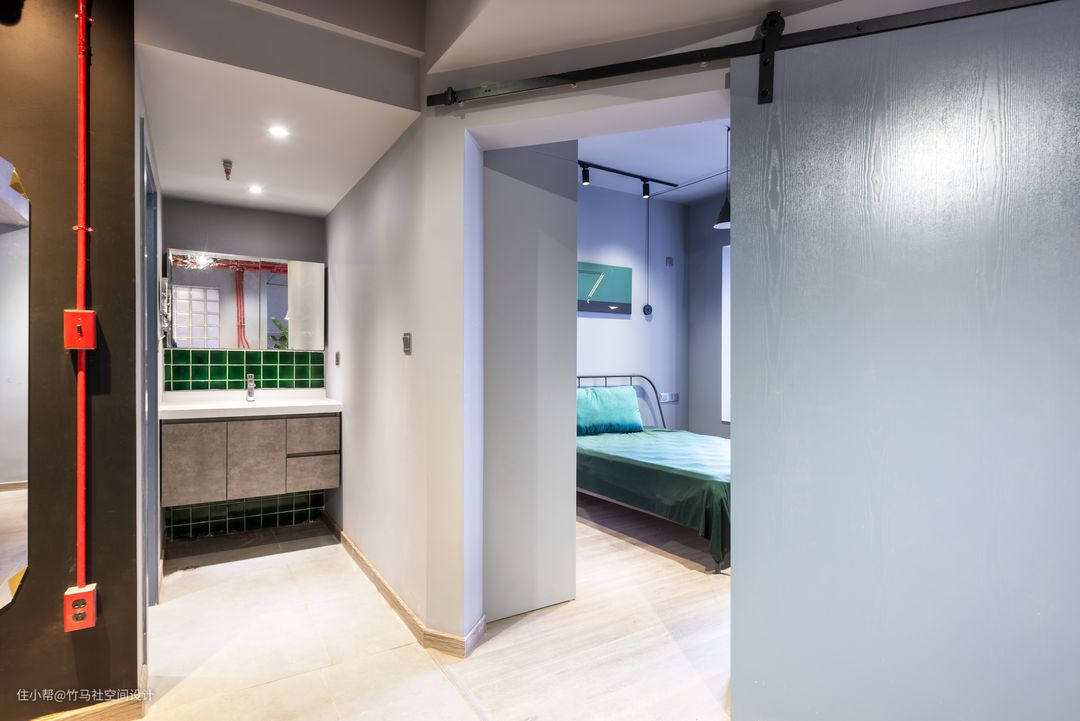 卫生间的墙面采用了绿色的复古小方砖,搭配灰色的镜柜,呼应红色线管的金属感。