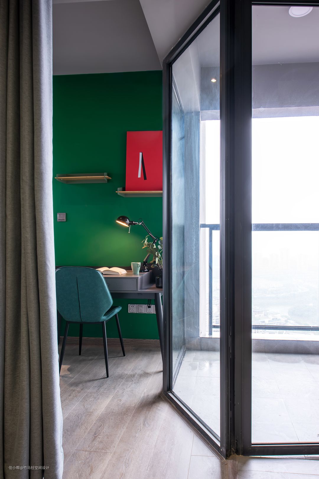 透过阳台斜切出的这个空间,可以看到绿色书房的一角。