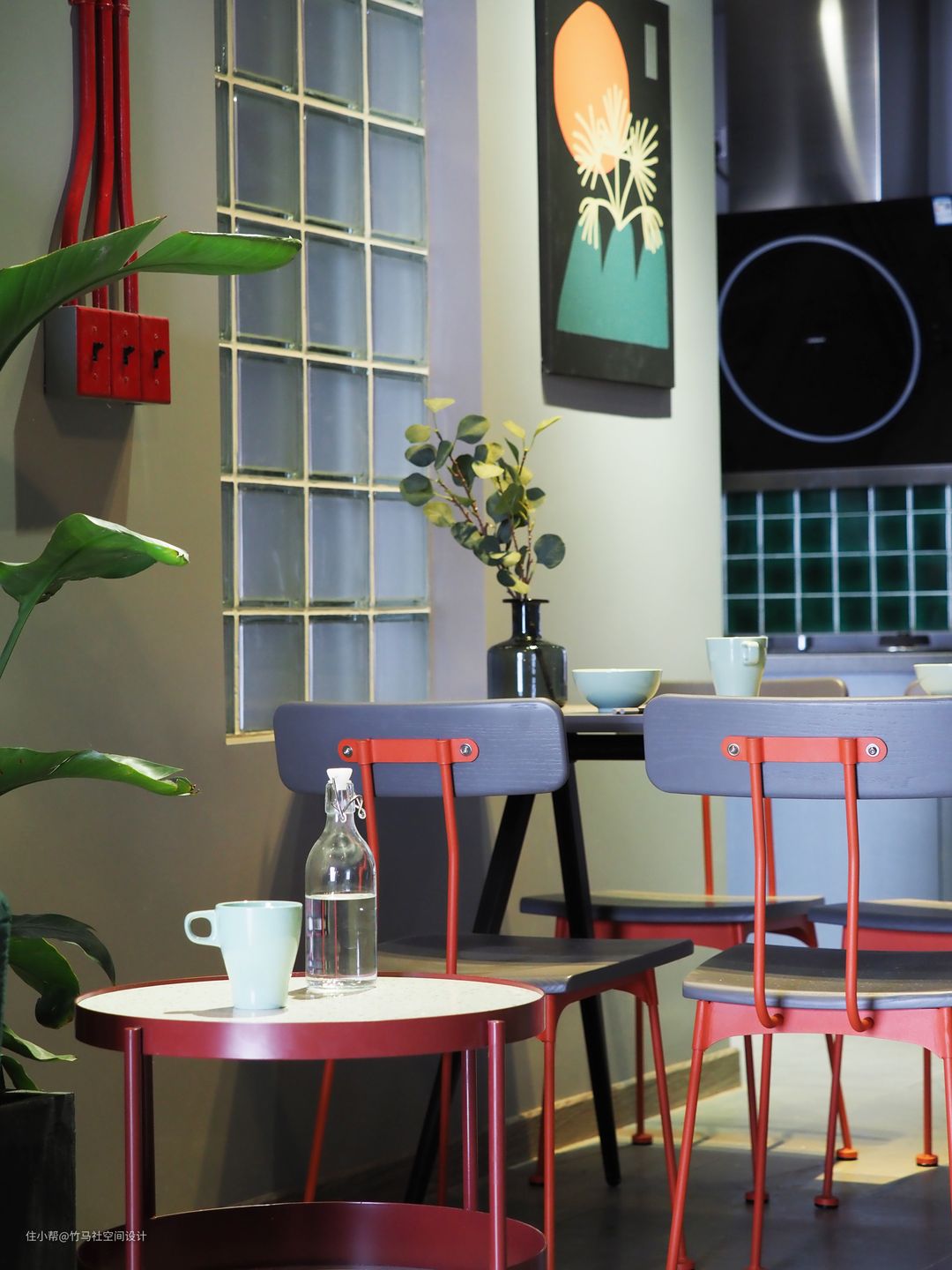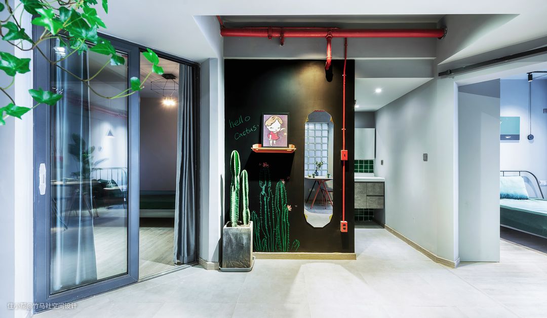 全屋的基础色是小叶喜爱的灰色色系,红色和绿色的撞色在朴素的灰色底色中更加的醒目。