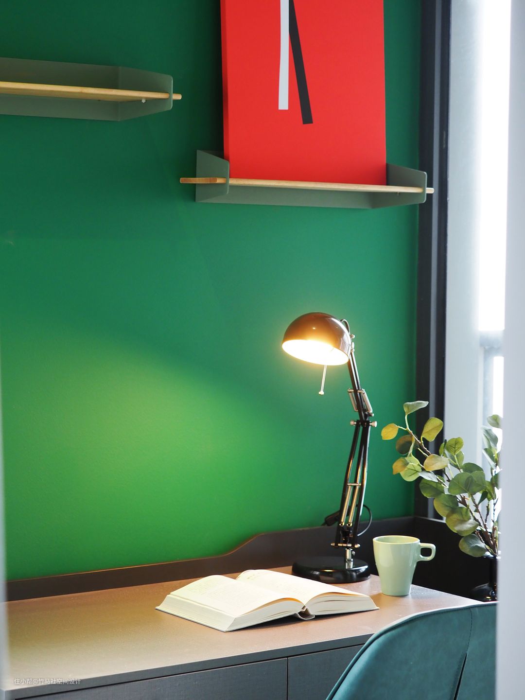 墨绿色的书房配上绿色的书架,和墙上的红色抽象画形成了鲜明的色彩反差。