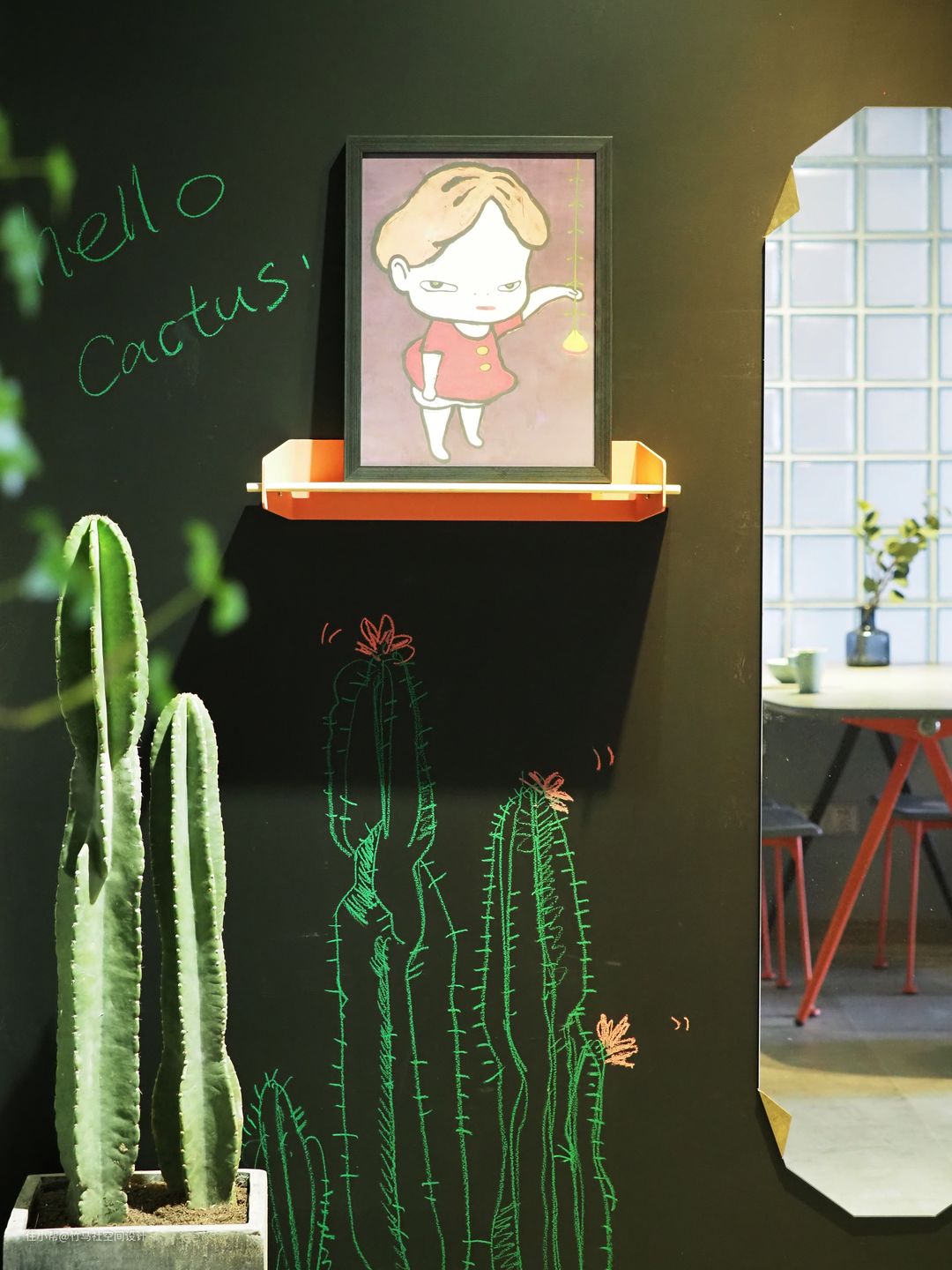 黑板墙上玩味童趣的涂鸦,配上和小叶神似的奈良美智小女孩头像,使这个小角落带有鲜明的个人风格。