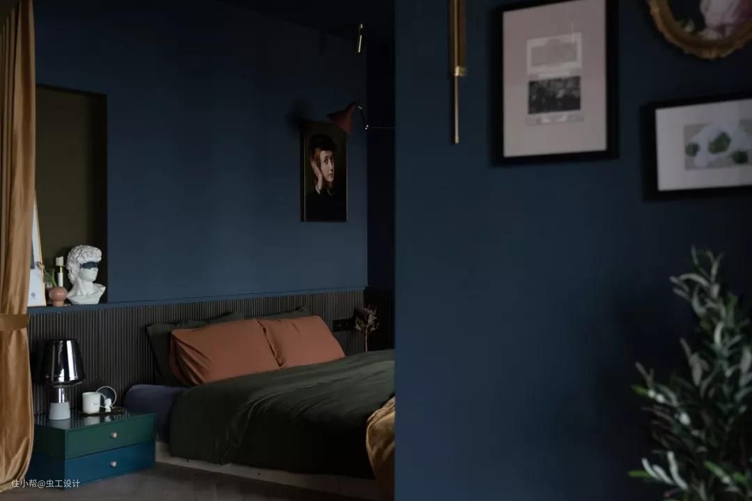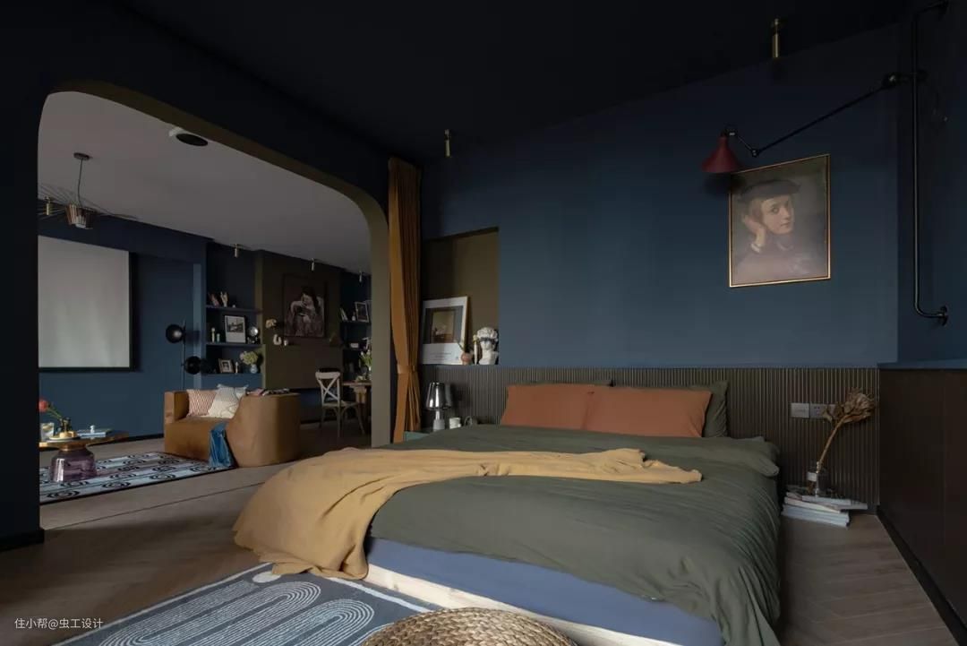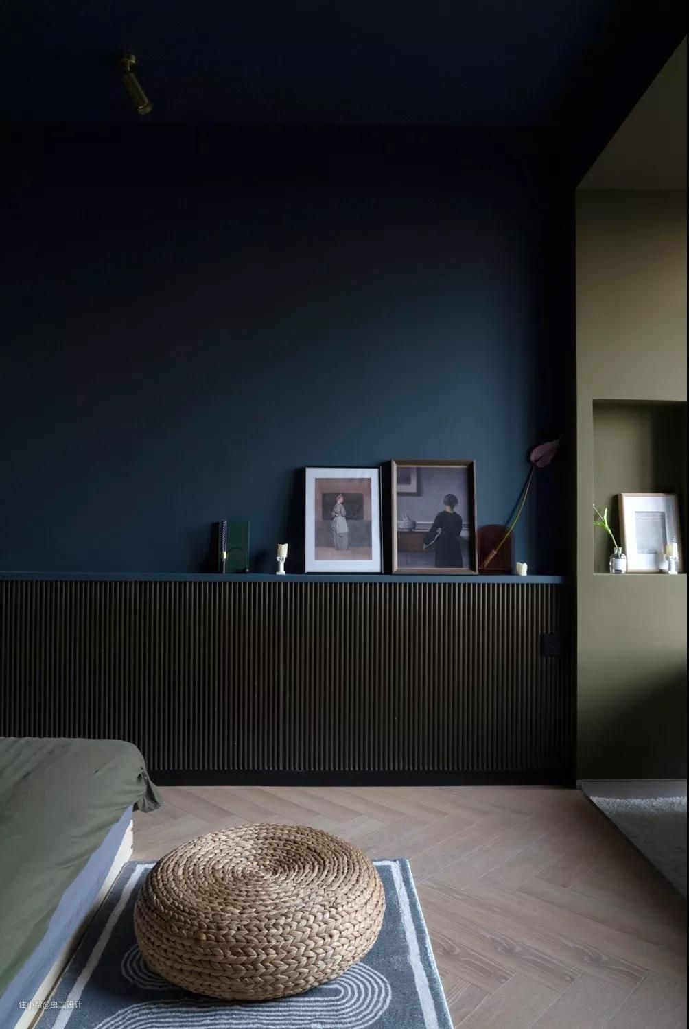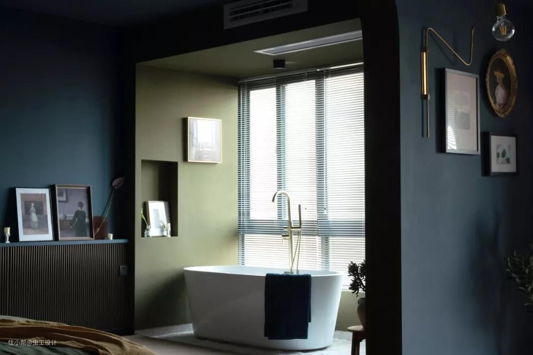 整个睡眠区的墙和顶都刷了让人沉静的深蓝色,有助于睡眠。用橄榄绿作为浴缸与睡眠区的区域分割,同时与床背景的壁龛色调相呼应,平衡了空间画面感。