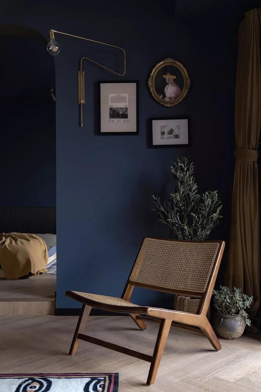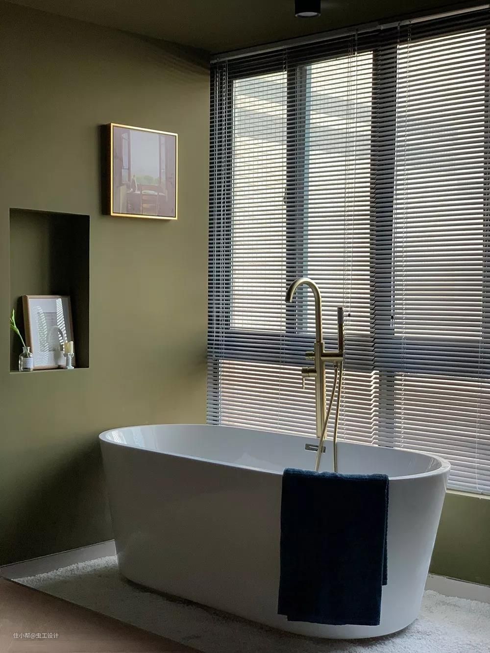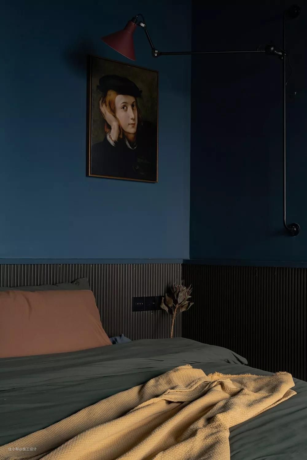 整个睡眠区的墙和顶都刷了让人沉静的深蓝色,有助于睡眠。用橄榄绿作为浴缸与睡眠区的区域分割,同时与床背景的壁龛色调相呼应,平衡了空间画面感。
