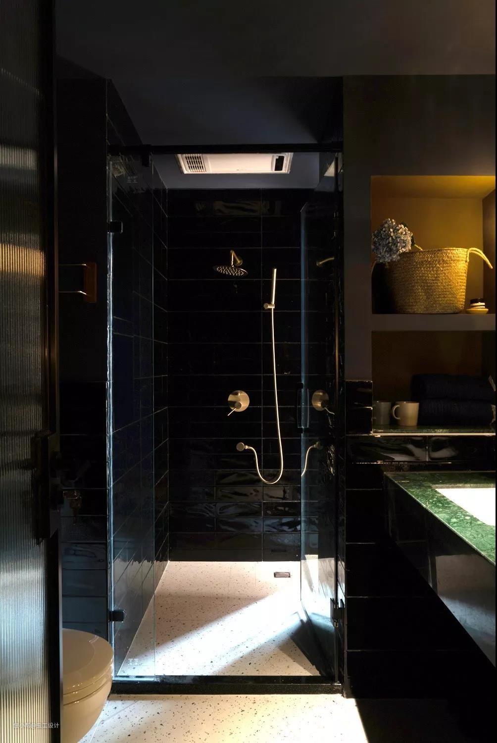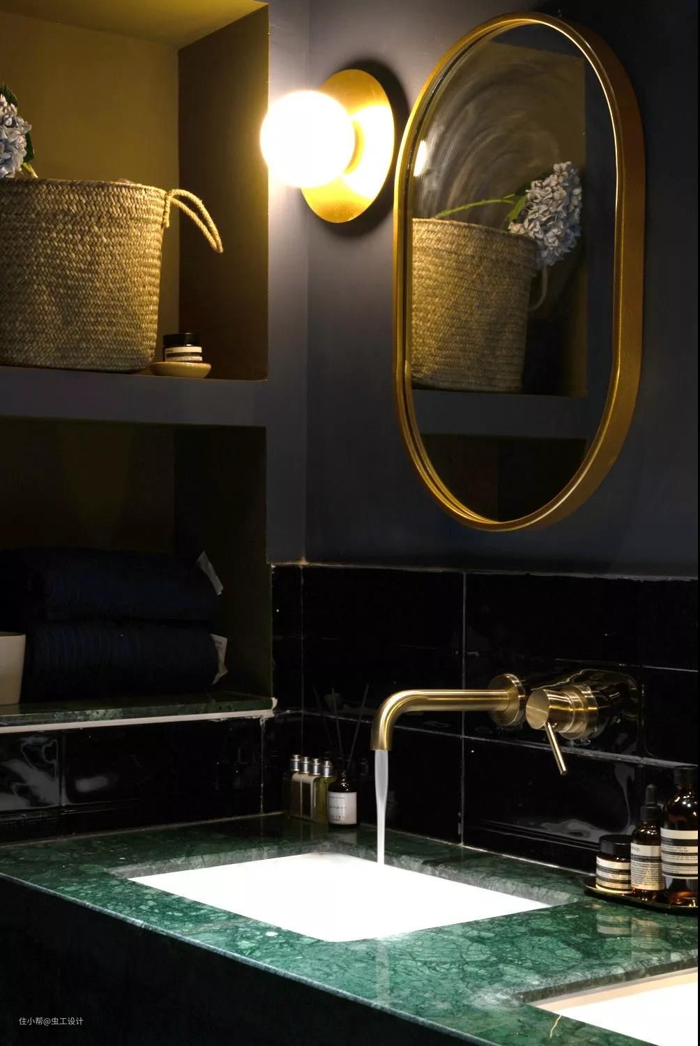 蓝灰色防水乳胶漆,加亮面黑色瓷砖作为空间底色,点缀铜元素的镜子和灯,以及长虹玻璃,暗黑中透露着精致与优雅。