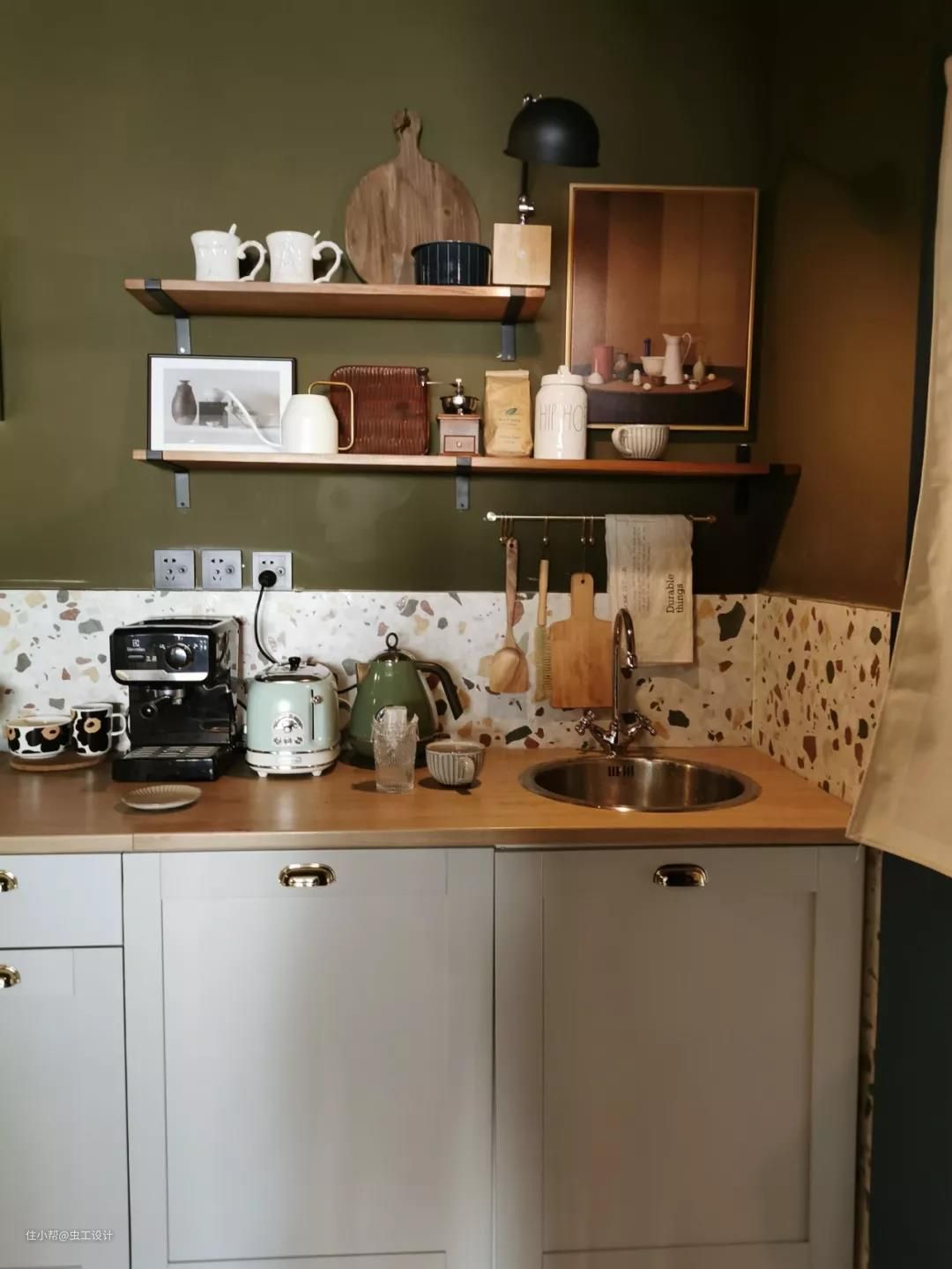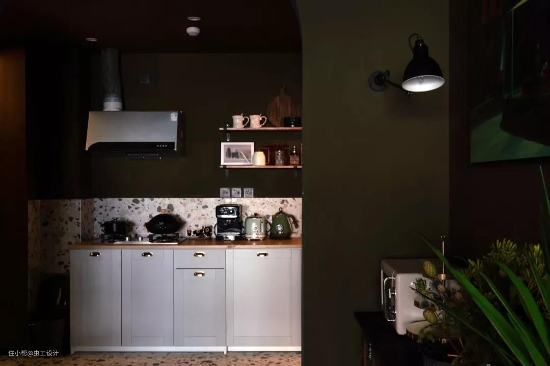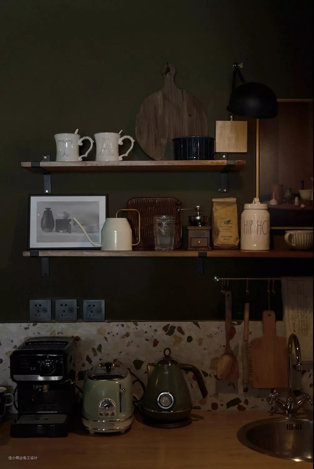 厨房电器以及餐具杯具与整个厨房的暗调及柔和的暖光营造出极具复古的生活氛围。