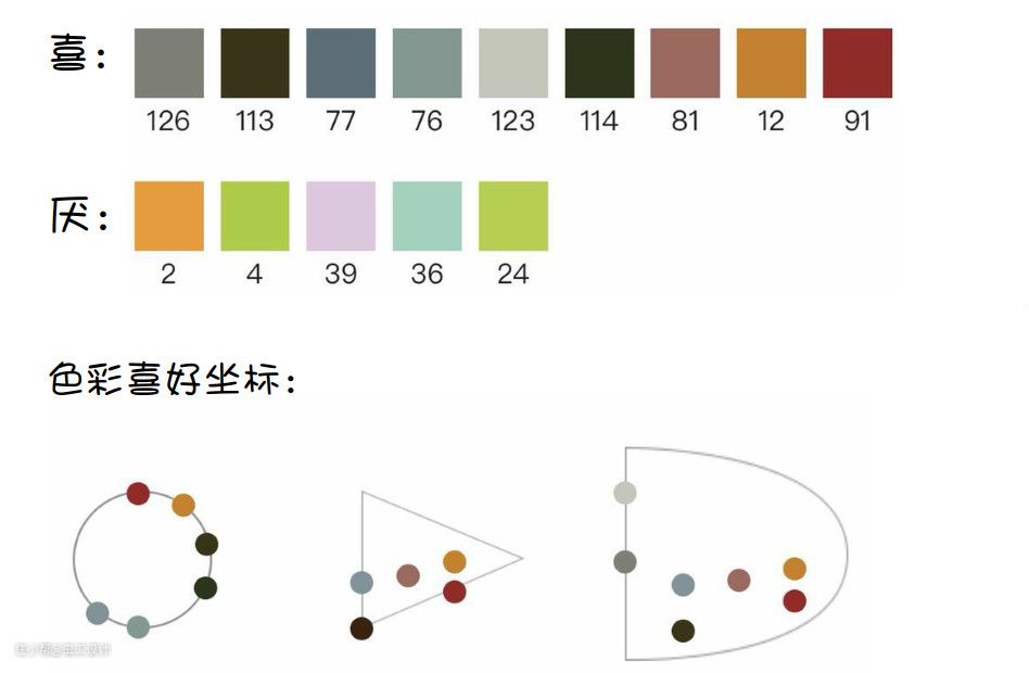 空间方案设计之前除了平面布局外,会对客户有一个色彩喜好测试。根据客户喜欢的10个颜色和5个不喜欢颜色来对其进行空间调性的分析