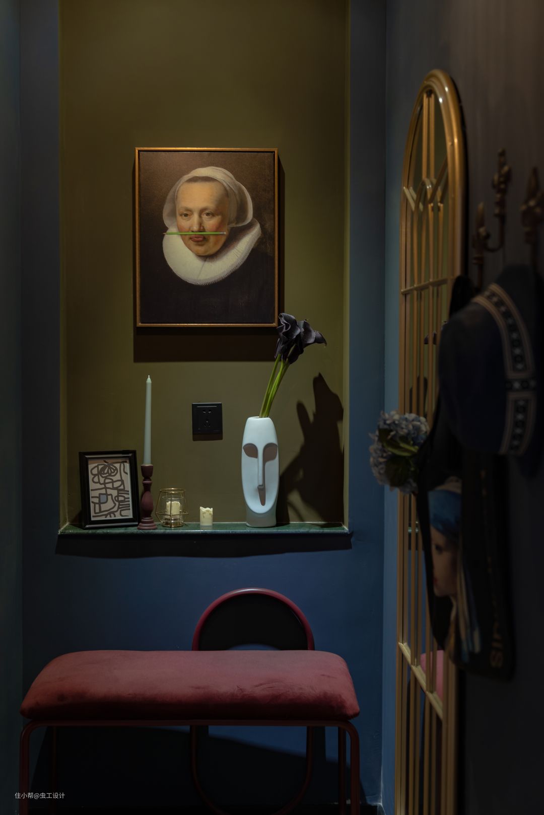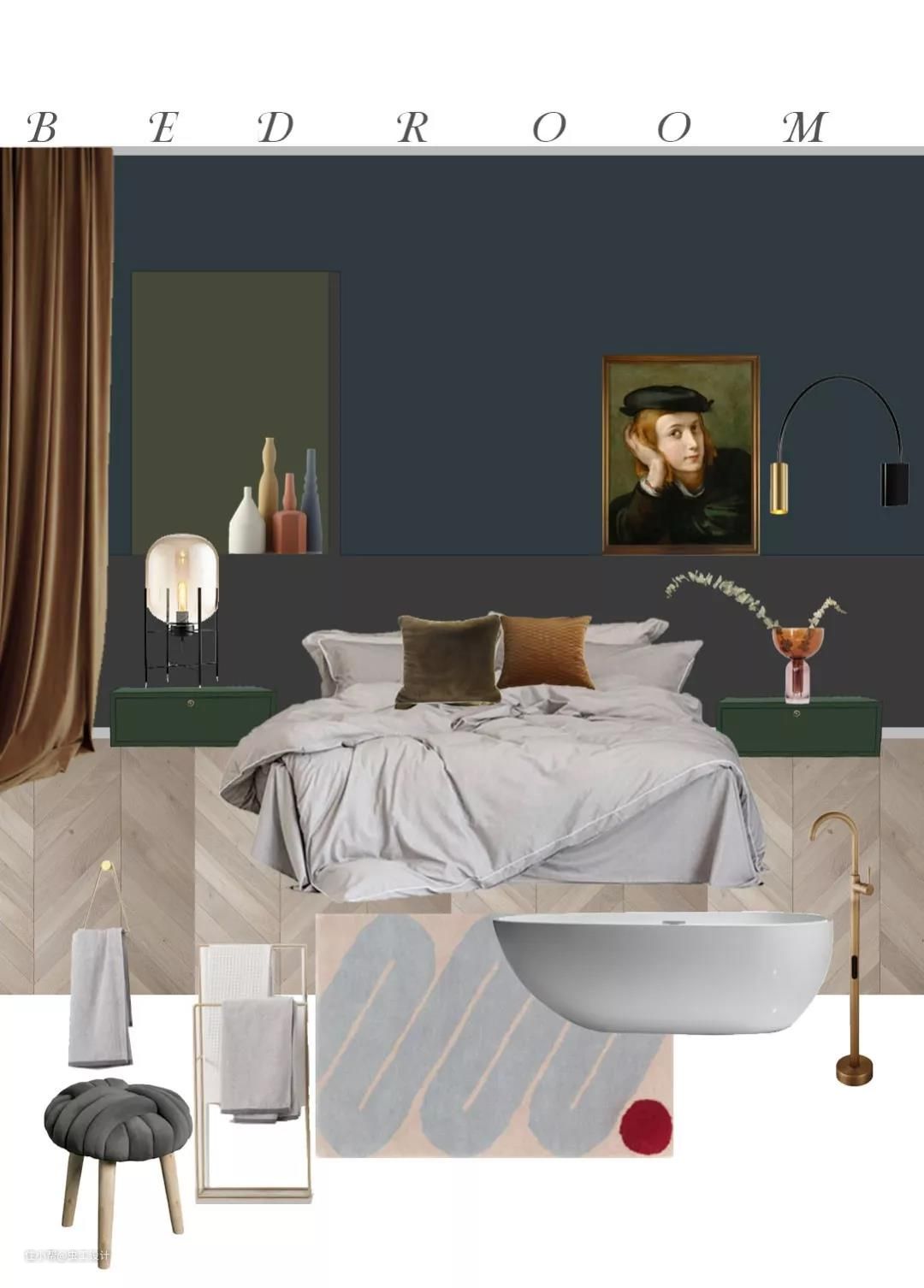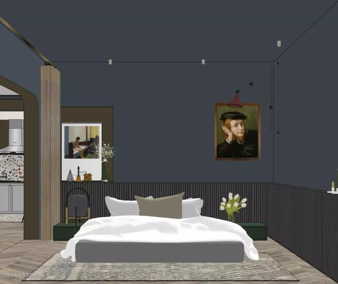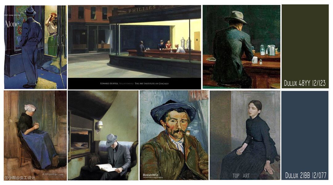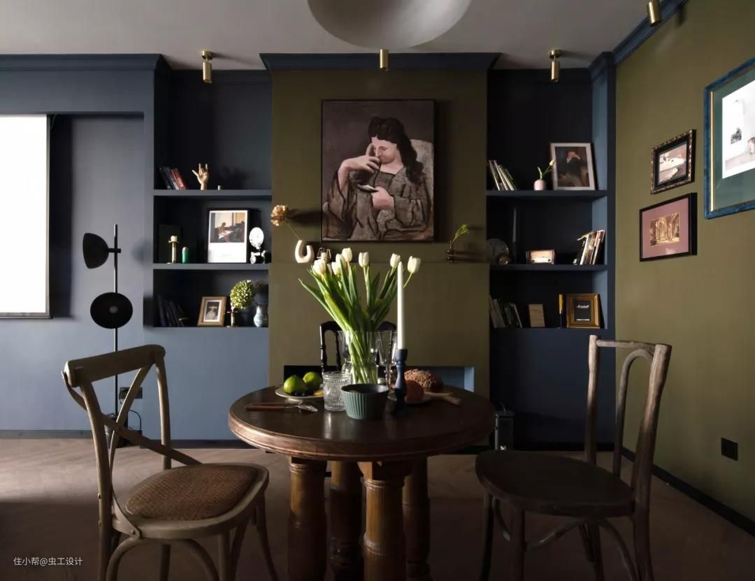 配色除了屋主给到的喜好色外,灵感来源于欧洲复古油画沉静的夜色与我逛荷兰国立、梵高美术馆等给到我的浓厚艺术氛围的空间体验。空间调性以及平面布局确定,对客户的喜好和需求有个深入的了解后,接下来才进入我们正式的空间方案设计。