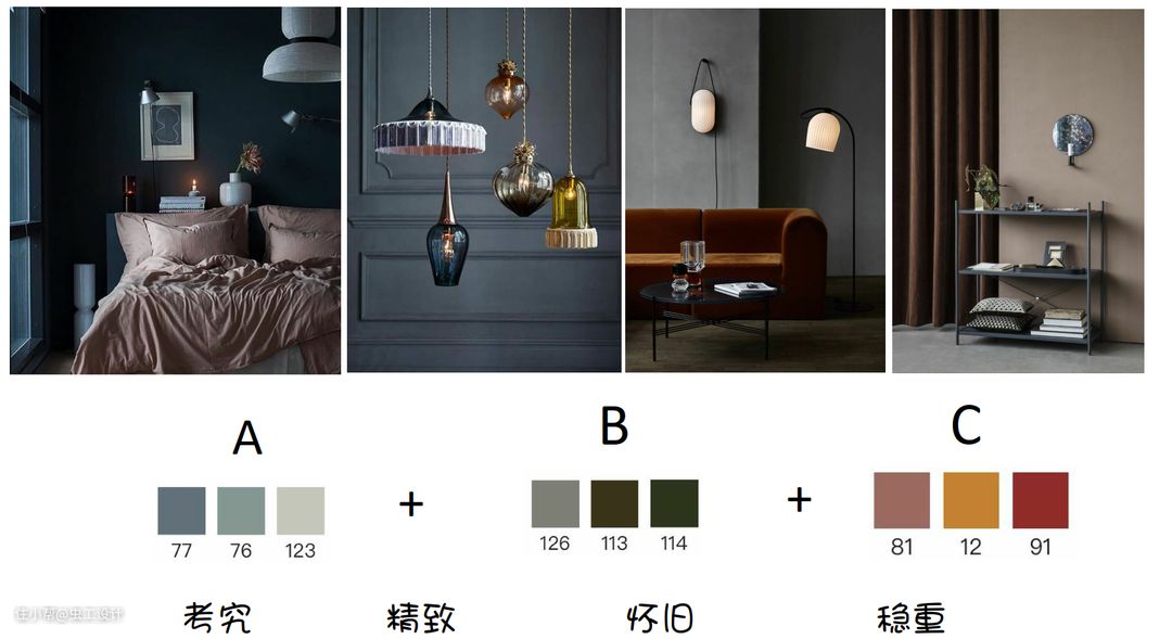 把客户的喜好色分为了A.B.C三大类,排列组合共做了七个调性选择,客户在里面最终选择了两个自己比较喜欢的调性,A+B利用色彩和肌理打造怀旧与沉静感。