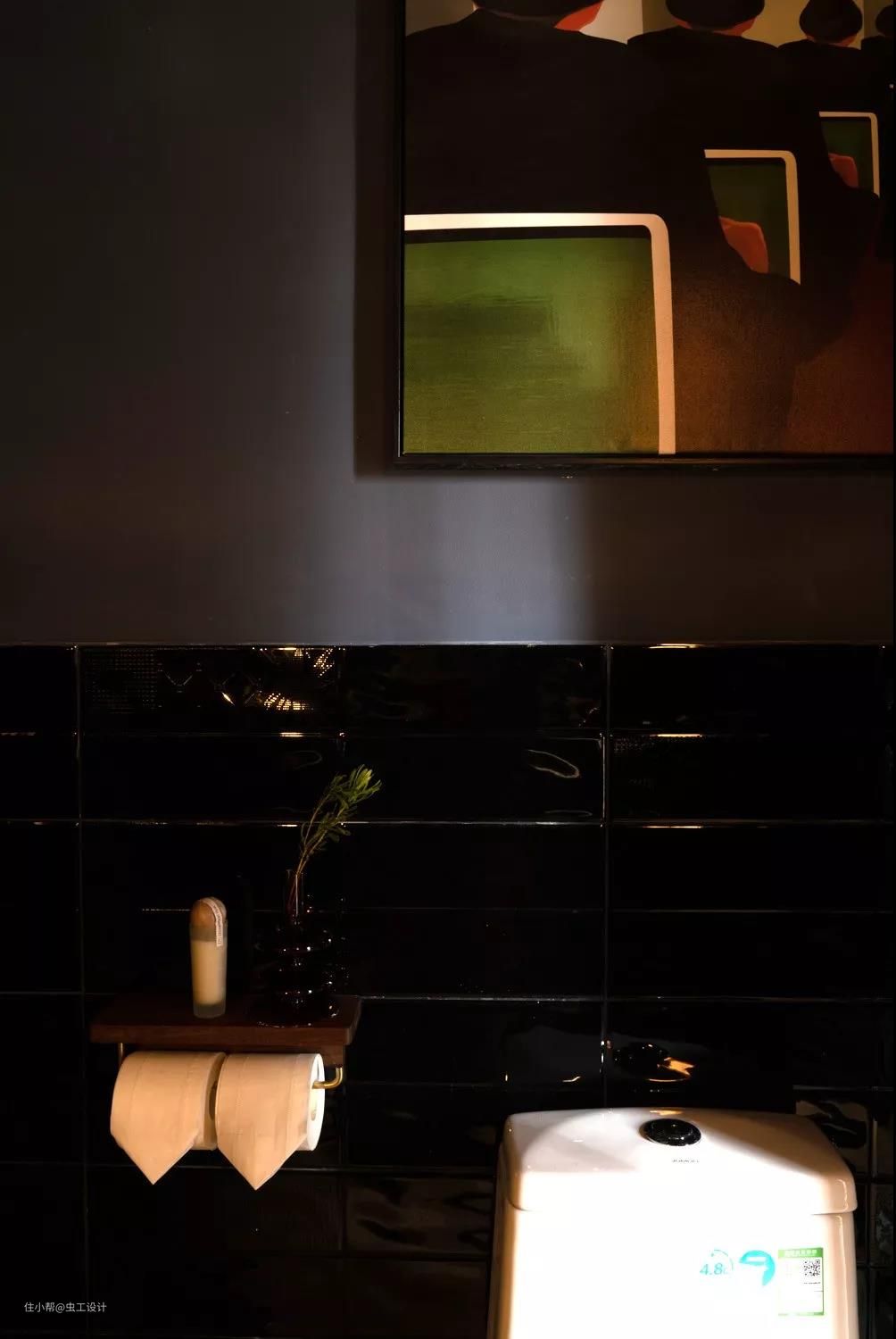 马桶旁边可以放纸巾和手机的胡桃木置物架,以及马桶背后的趣味挂画,无处不在的小细节。