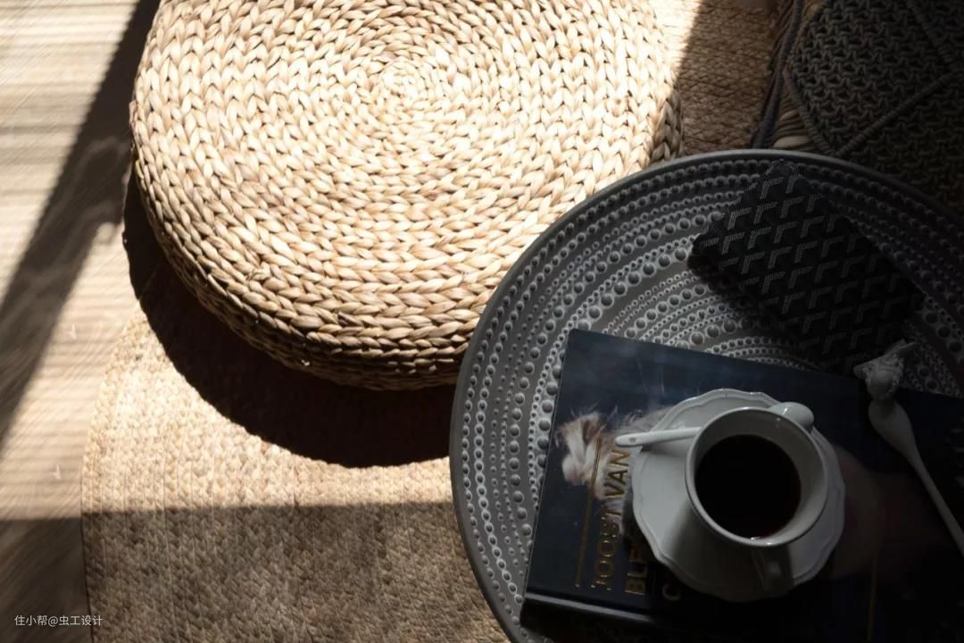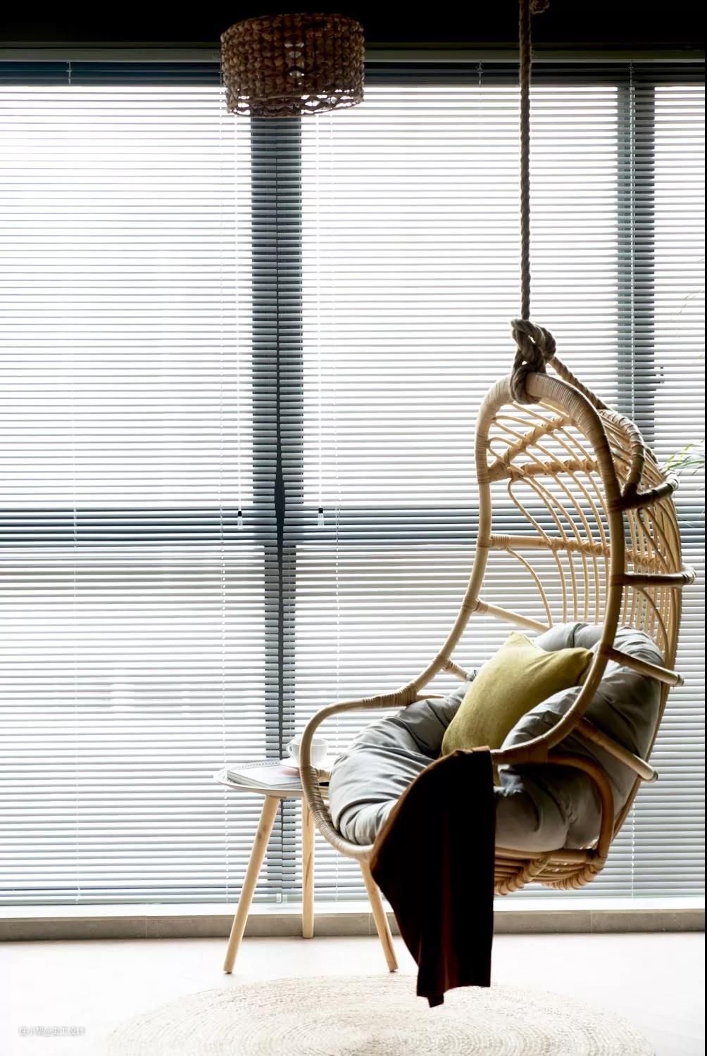 让人放松和放空的吊椅#麻绳与竹搭配的吊椅以及草编的地毯,质朴而自然。