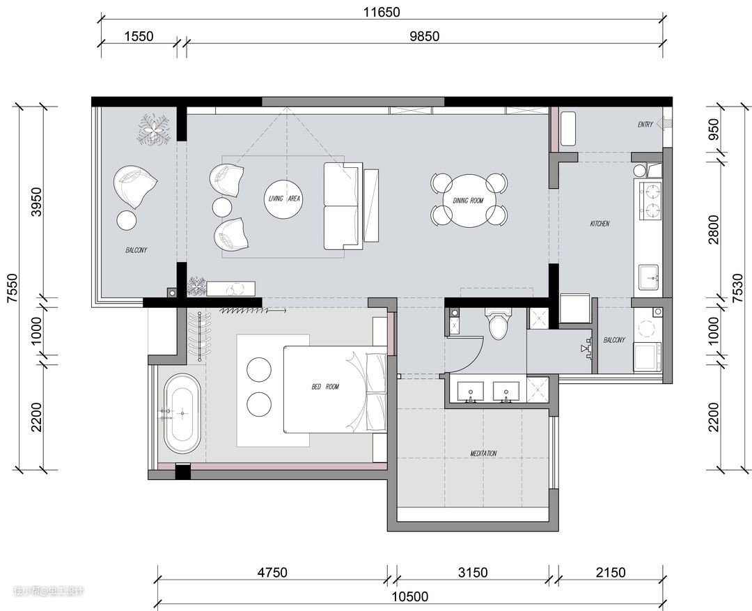 4.睡眠区不仅改变了开门方向与客厅既相连又独立,同时利用原始的飘窗位置做了独立泡澡区,提升了睡眠区域的品质。