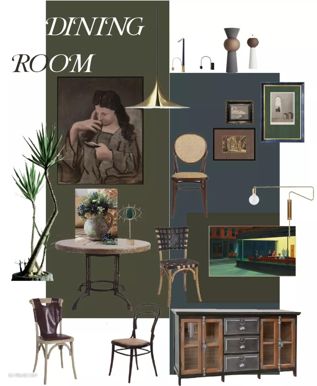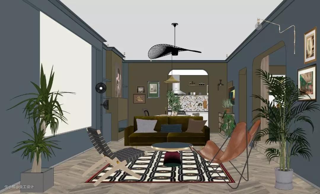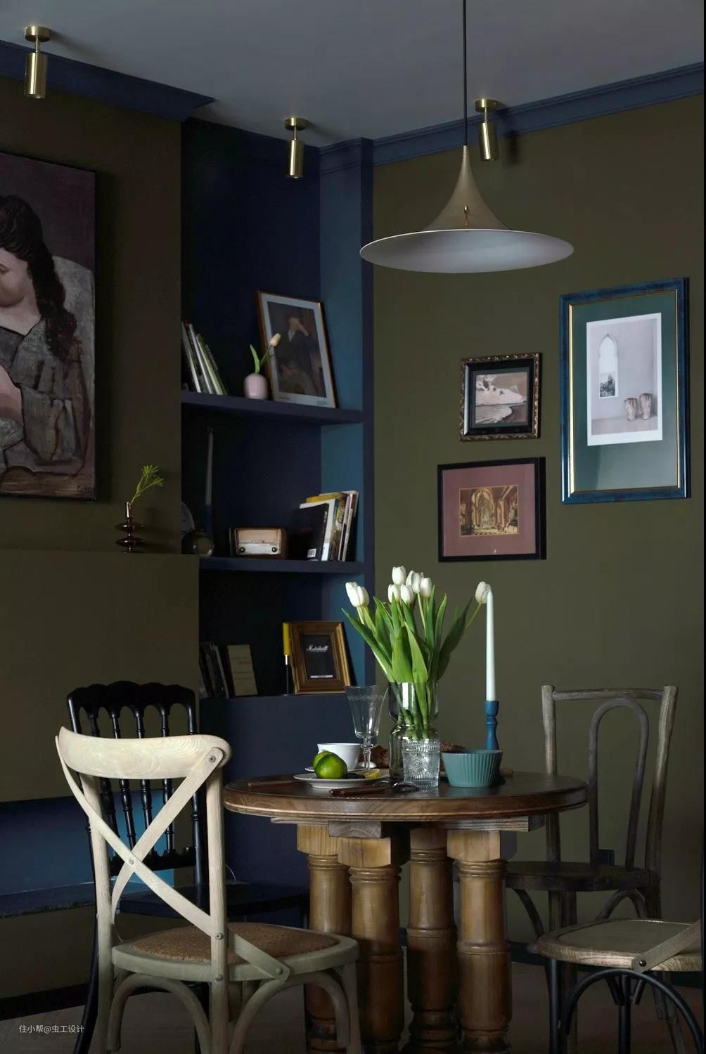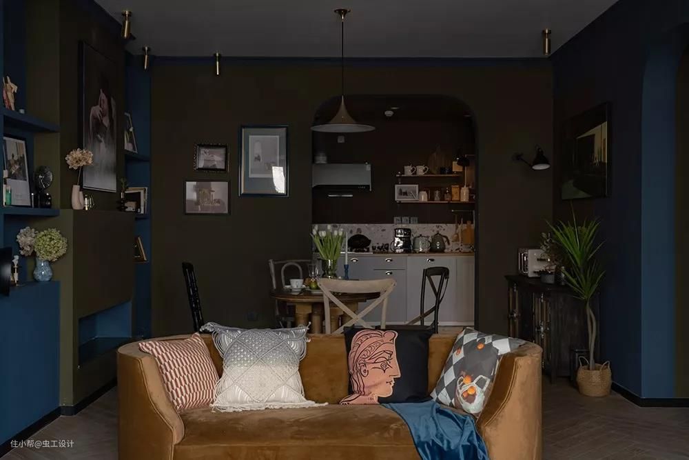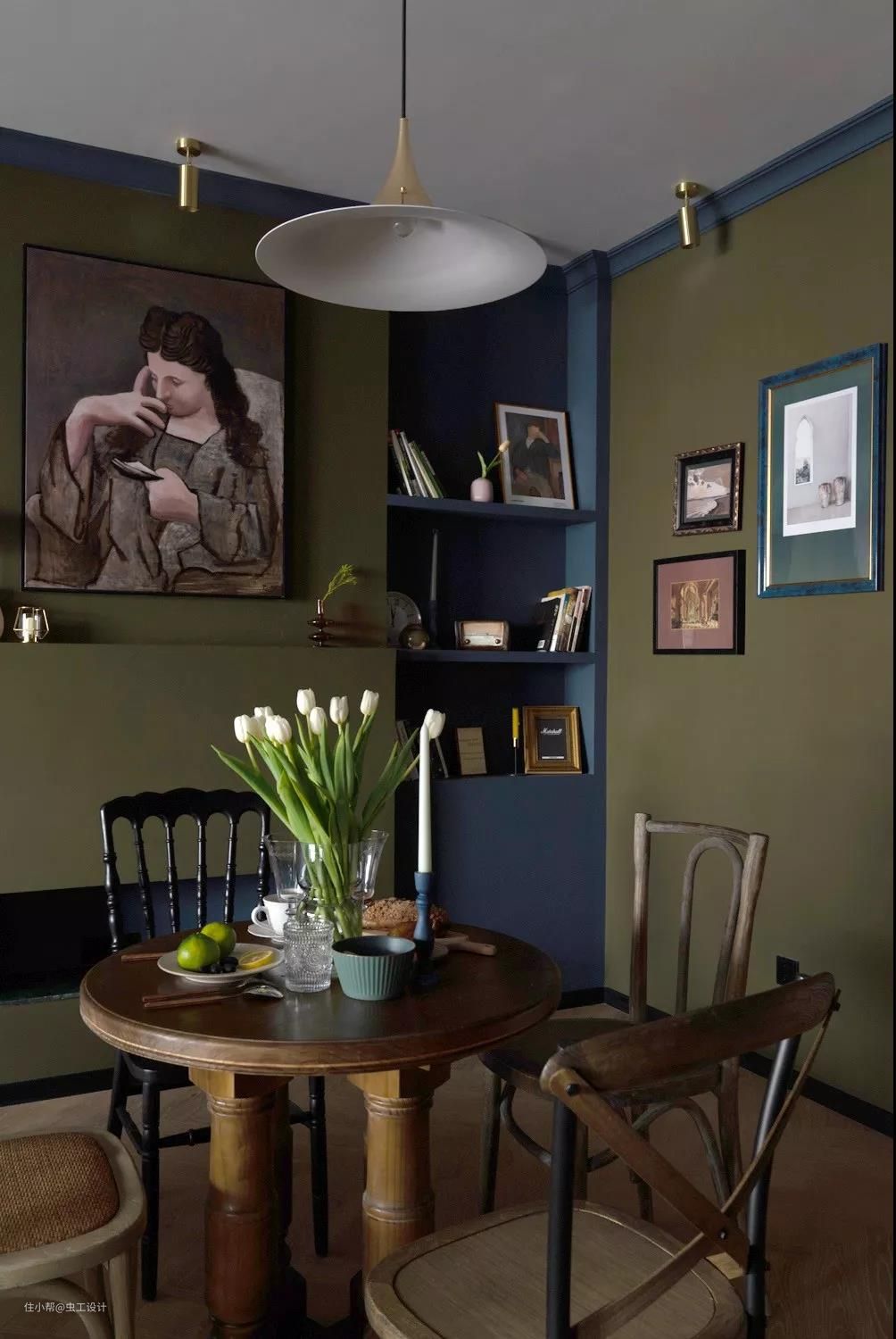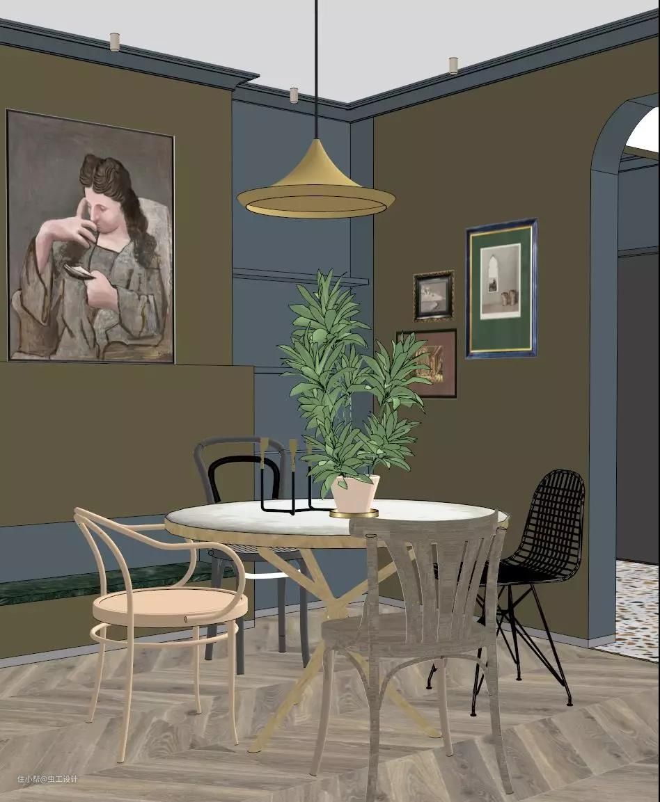 配色除了屋主给到的喜好色外,灵感来源于欧洲复古油画沉静的夜色与我逛荷兰国立、梵高美术馆等给到我的浓厚艺术氛围的空间体验。空间调性以及平面布局确定,对客户的喜好和需求有个深入的了解后,接下来才进入我们正式的空间方案设计。