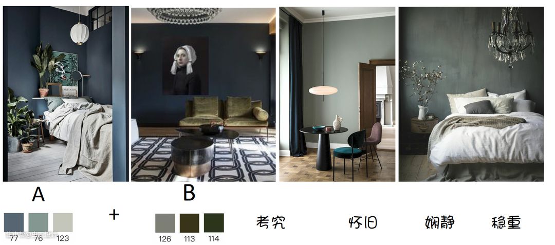 把客户的喜好色分为了A.B.C三大类,排列组合共做了七个调性选择,客户在里面最终选择了两个自己比较喜欢的调性,A+B利用色彩和肌理打造怀旧与沉静感。