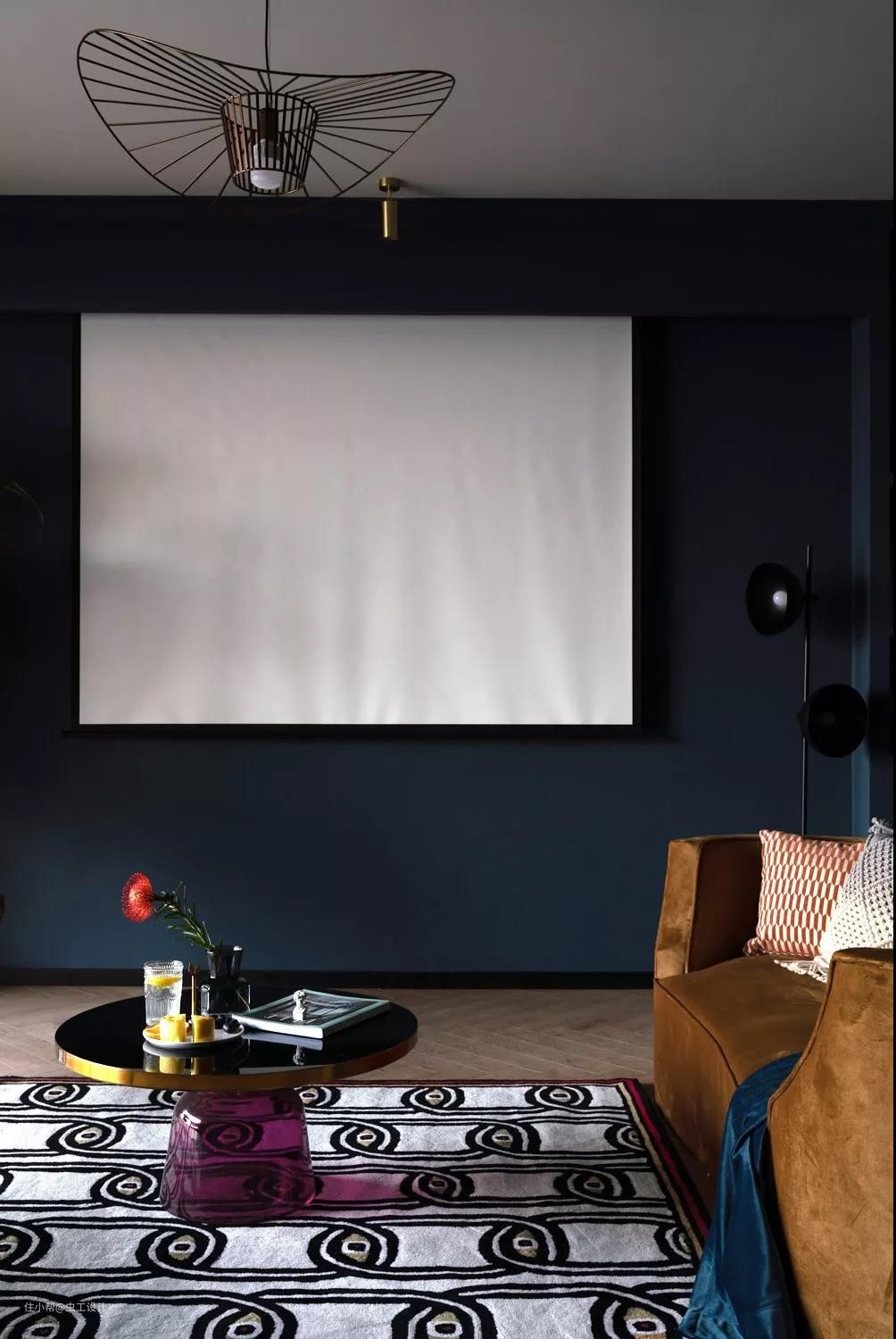 利用餐厅的壁炉墙与书架外凸的部分做了投影幕布盒子,与整体造型齐平,同时延伸到右侧的空调吊顶,通过颜色的分割,整体统一而又富有层次。
