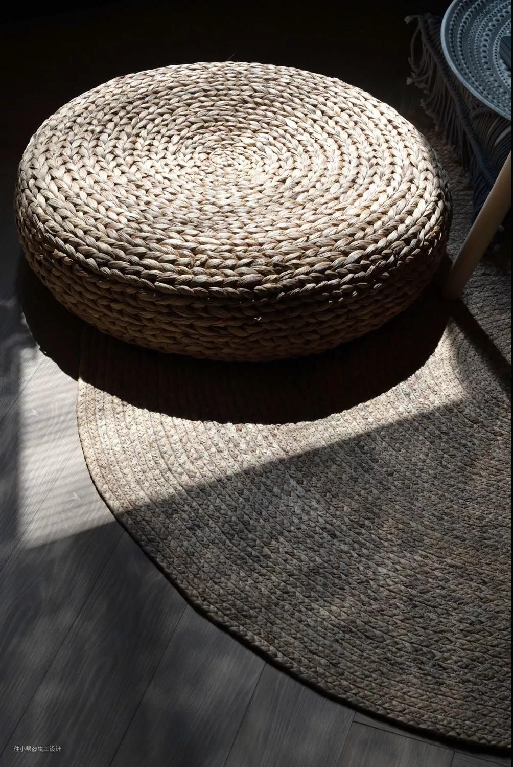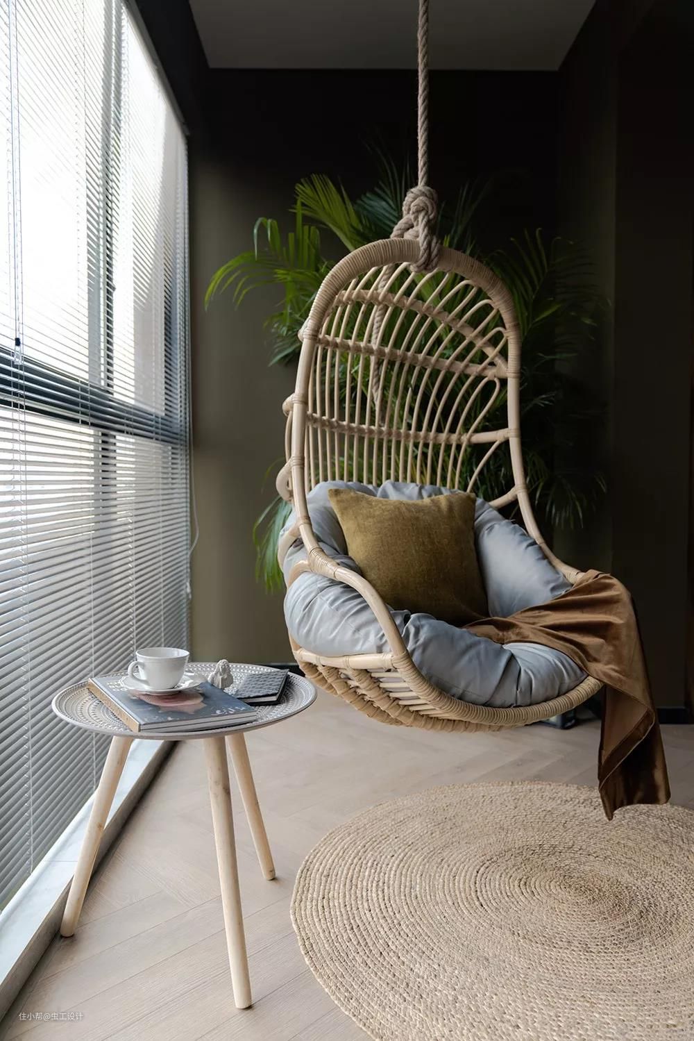 让人放松和放空的吊椅#麻绳与竹搭配的吊椅以及草编的地毯,质朴而自然。