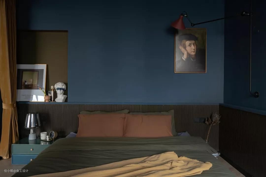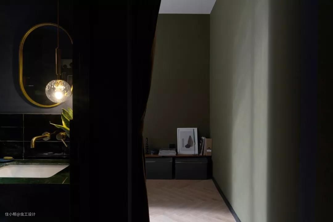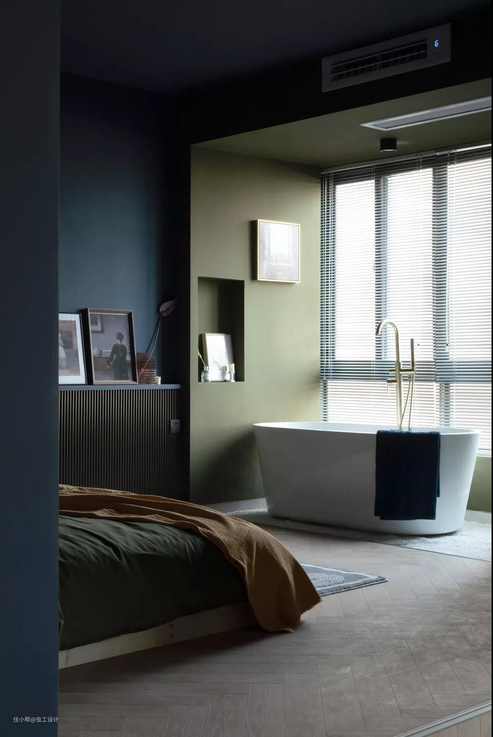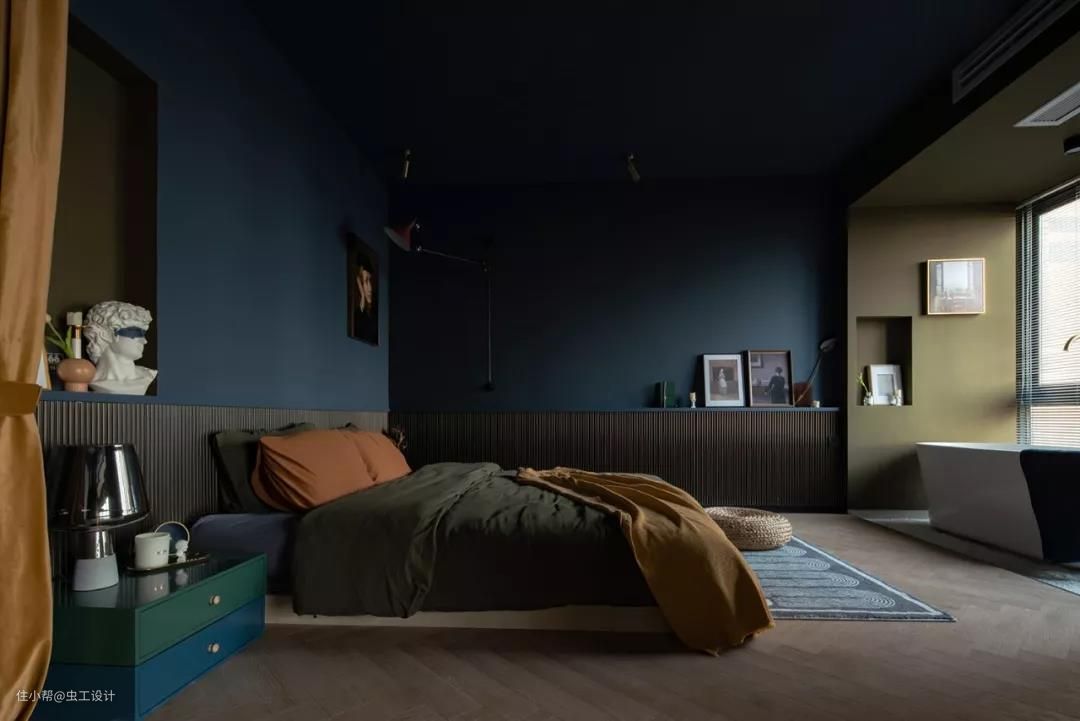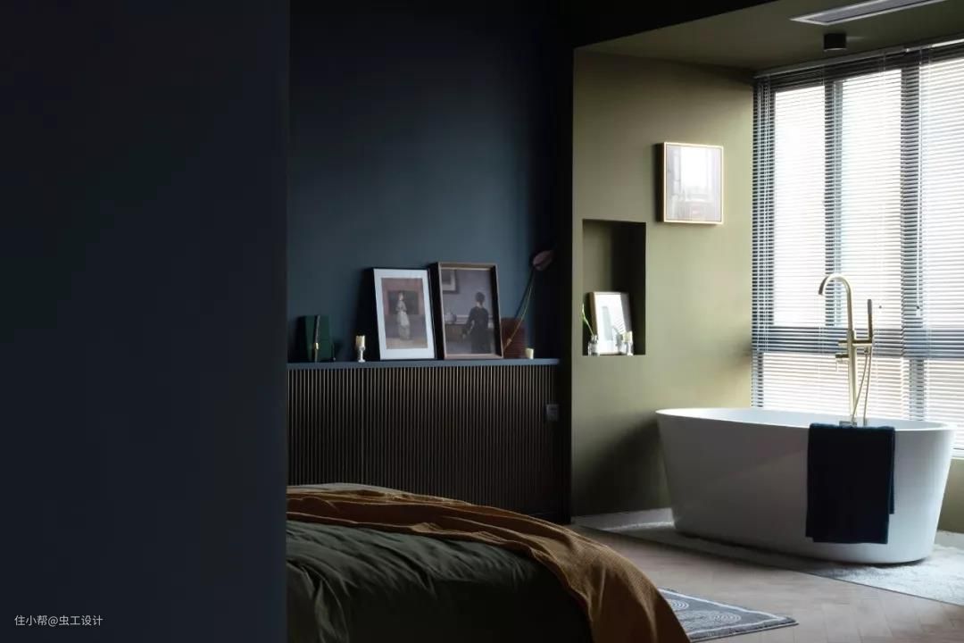 整个睡眠区的墙和顶都刷了让人沉静的深蓝色,有助于睡眠。用橄榄绿作为浴缸与睡眠区的区域分割,同时与床背景的壁龛色调相呼应,平衡了空间画面感。