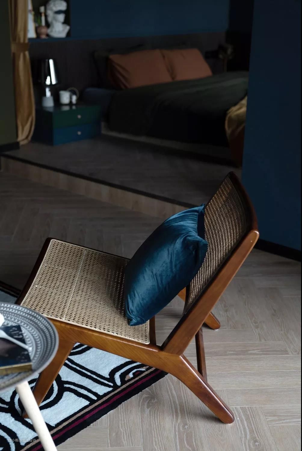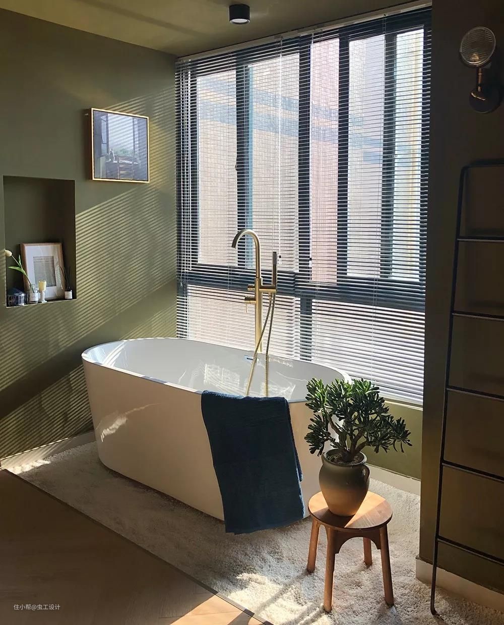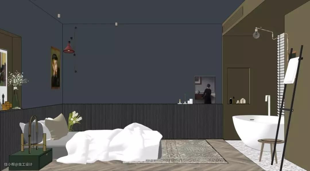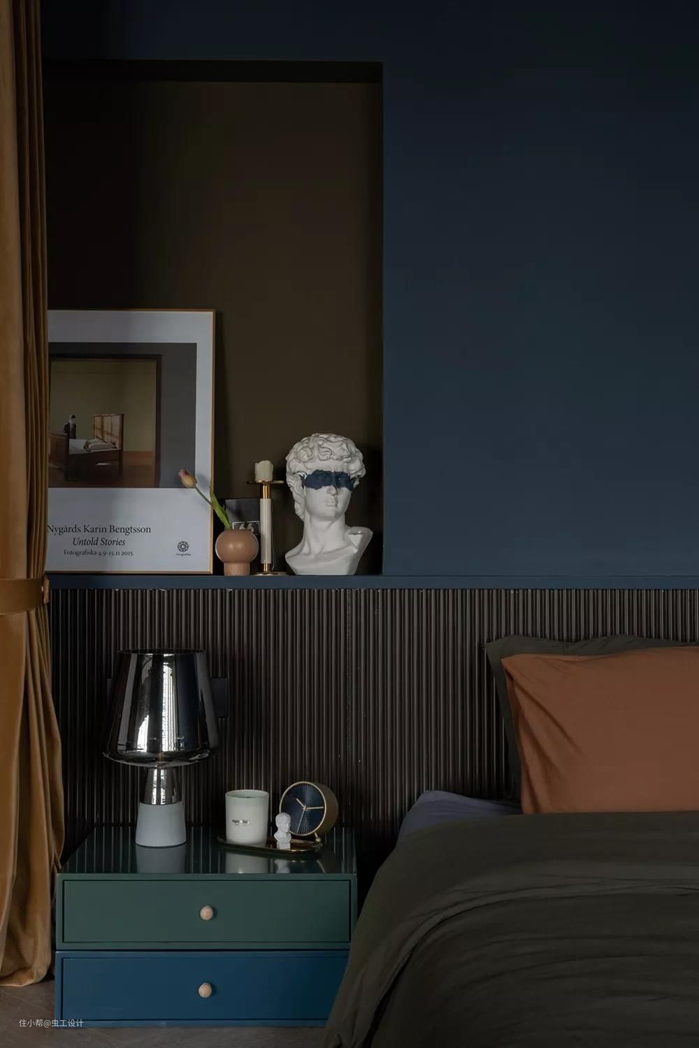 整个睡眠区的墙和顶都刷了让人沉静的深蓝色,有助于睡眠。用橄榄绿作为浴缸与睡眠区的区域分割,同时与床背景的壁龛色调相呼应,平衡了空间画面感。