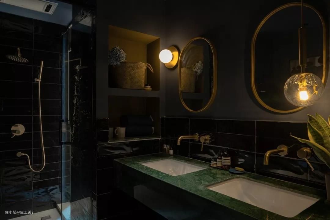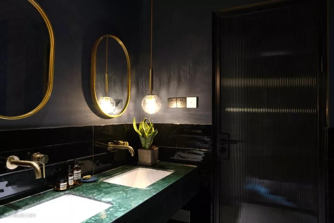蓝灰色防水乳胶漆,加亮面黑色瓷砖作为空间底色,点缀铜元素的镜子和灯,以及长虹玻璃,暗黑中透露着精致与优雅。