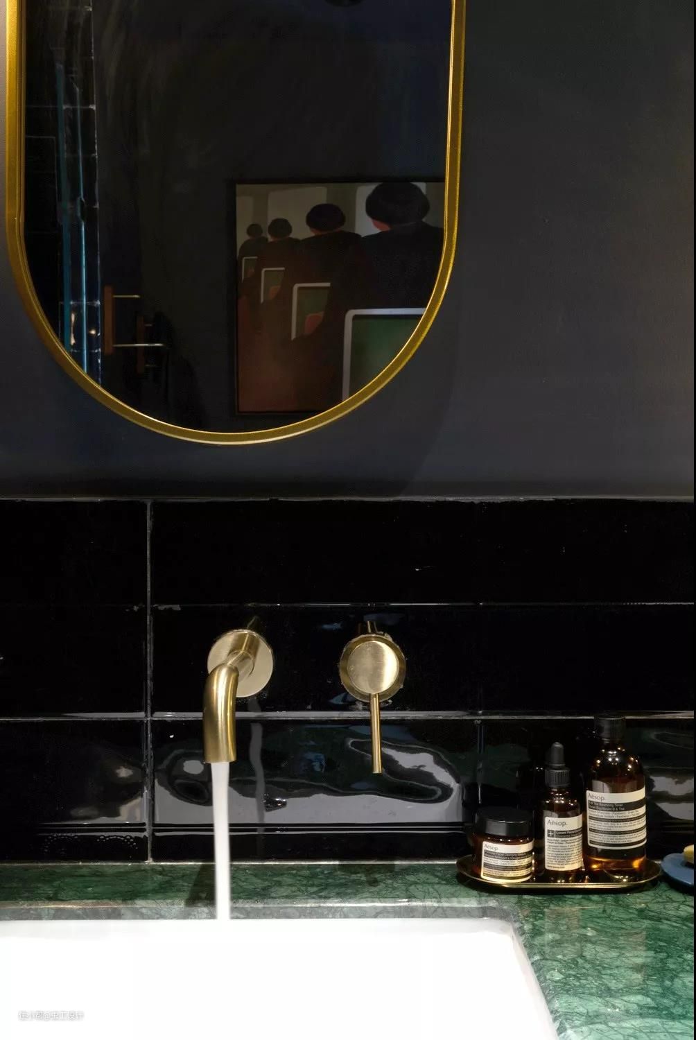 蓝黑色的墙面基调搭配铜色的镜子与墙排龙头及墨绿色的洗手台,复古且精致。