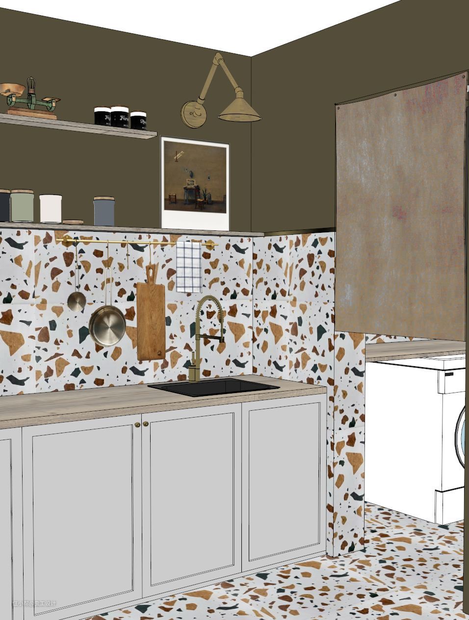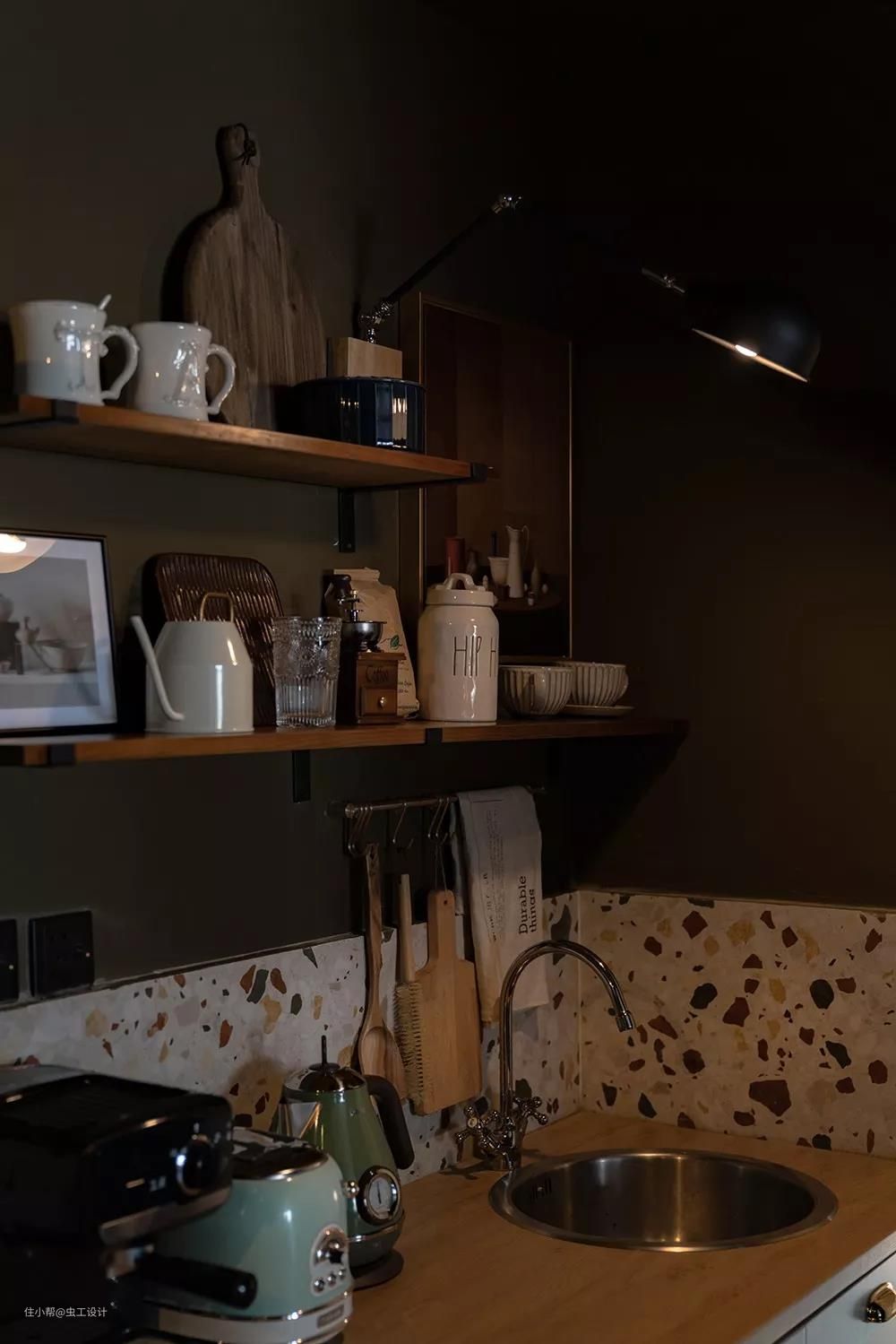 厨房电器以及餐具杯具与整个厨房的暗调及柔和的暖光营造出极具复古的生活氛围。