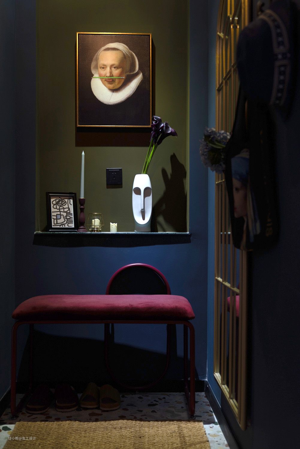 原始没有独立的玄关,一进门就是一览无余的客餐厅。将原始入户门洞封起来,同时预留出壁龛位做了玄关端景的同时也有了独立换鞋位。