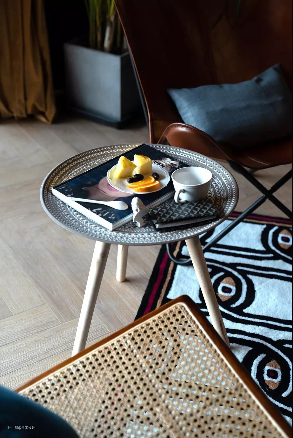 极具自然的藤编、牛皮休闲躺椅与充满生机的散尾葵,打造休闲舒适的会客空间