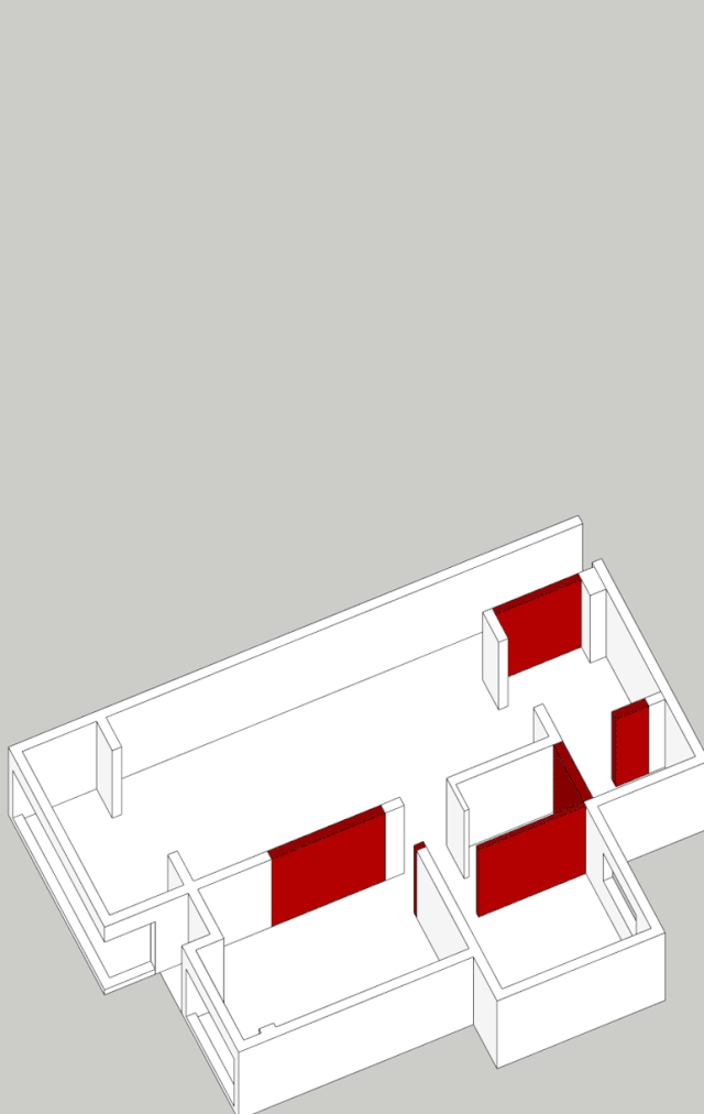 拆改与新建示意动图:红色部分为需要打拆部分,空间瞬间开阔不少,新建墙体(蓝色))及抬高部分(绿色)