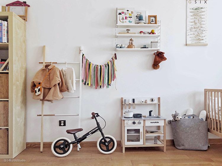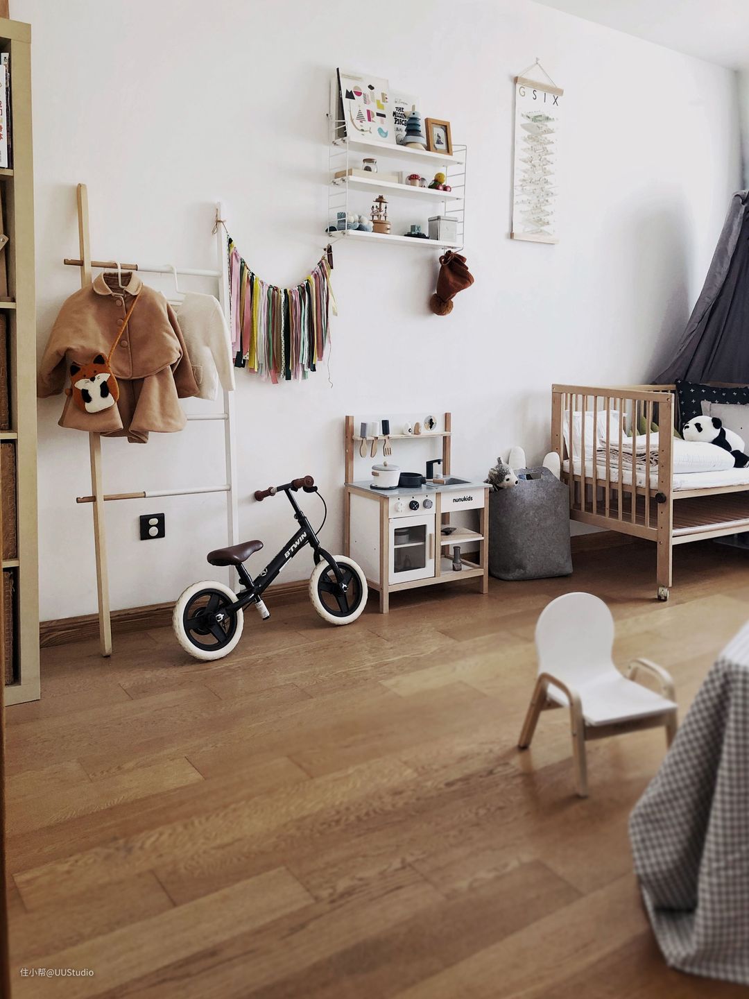 △ 儿童房,我们主张不做任何固定家具(当然,这也是因为房子本身面积足够)。来应对 UU 成长过程中的各个状态。 从起初的空无一物,到有了海洋球池,有了帐篷,有了滑滑梯和秋千……都是在成长不同时期,开始能驾驭的玩具。