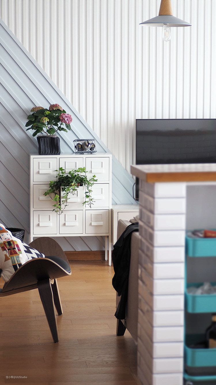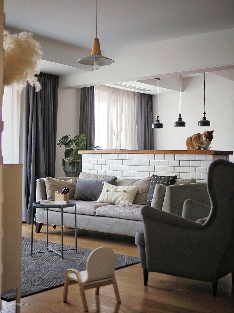 一开始吧台的设计,是因为两个人的时候,喜欢边看电视边吃饭,这可能也是不少小夫妻和单身人士会出现的状态。所以在客厅餐厅之间加入了吧台,简单吃饭看电视时可以在这里。坐的舒服胜于在茶几上吃饭的憋屈,对自己的胃好一点~