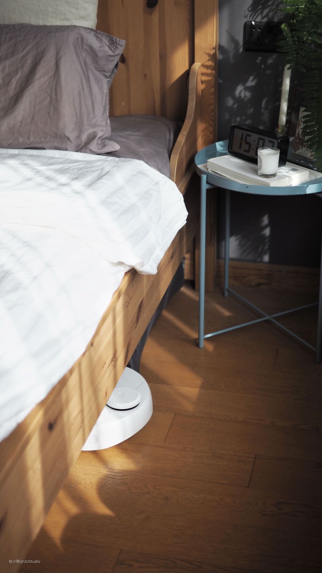 △ 床头柜换成了「IKEA」“格拉登 托盘桌”。细腿造型更显通透,唯一的问题是扫拖一体机进不去,只能绕圈打转转。