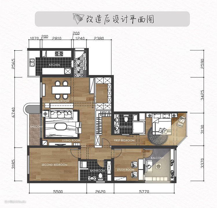 △ 调整后的空间,更加整体,更为开阔。在客餐厅区域新建一面整墙,增加了面对餐厅的储藏室,同时主卧也拥有了衣帽间,将所有细碎通道空间整合。原有主卫是暗室,通风差。向外延伸一部分,增加浴缸位置以及窗户透气。书房梯形调整为方形,拥有超大阳台。