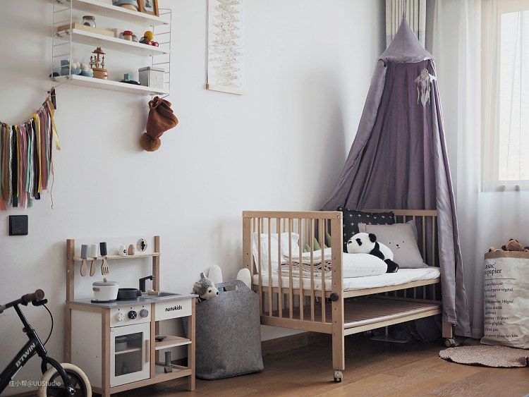 △ 可能是整屋里最实在的卧室照片了……有了孩子之后,婴儿床怎么可能不出现在卧室。一开始为了性价比选的「IKEA」松木床,床头床尾和婴儿床组合,反而变成了相对安全的三边围合,就不需再加护栏。