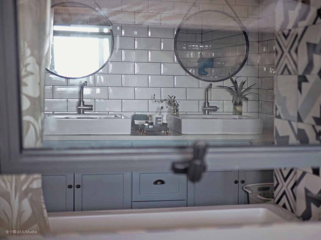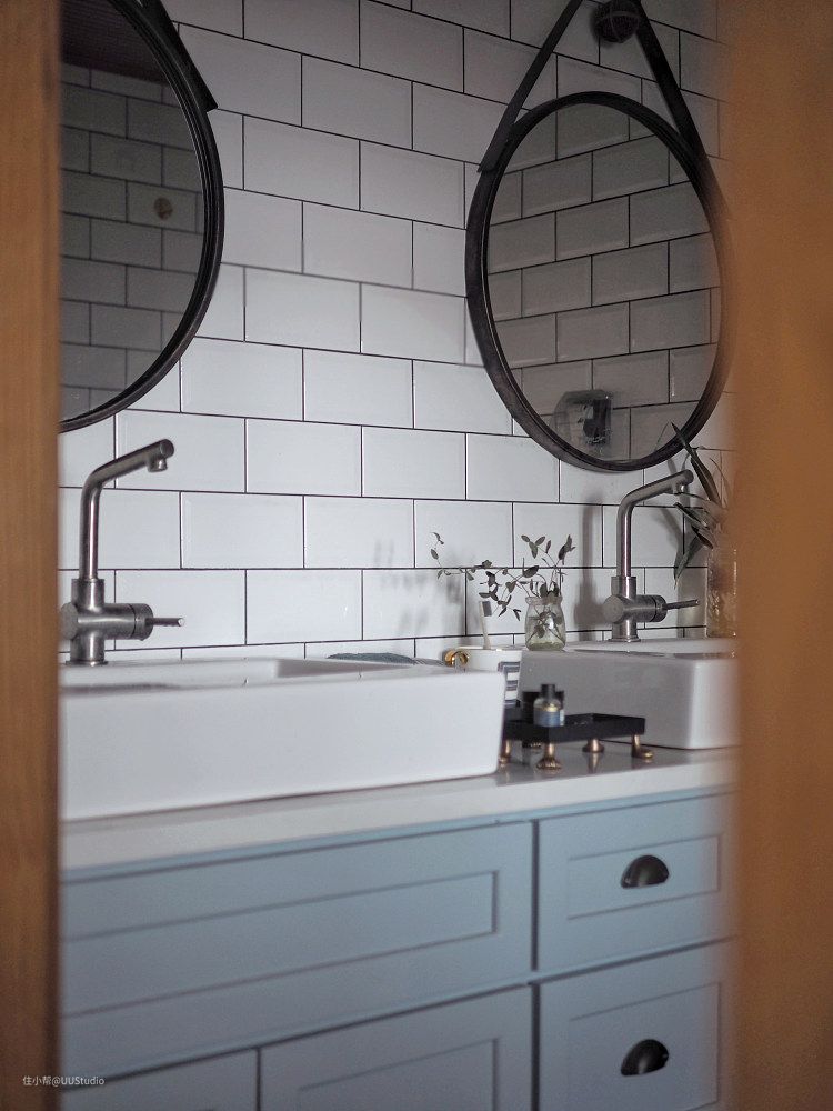 △ 主卫的配饰有一些金色元素。搭配古铜的圆镜、古铜的把手等等。