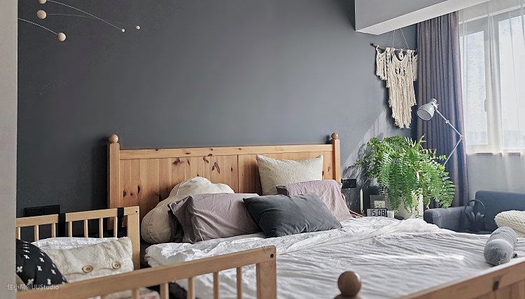 △ 可能是整屋里最实在的卧室照片了……有了孩子之后,婴儿床怎么可能不出现在卧室。一开始为了性价比选的「IKEA」松木床,床头床尾和婴儿床组合,反而变成了相对安全的三边围合,就不需再加护栏。
