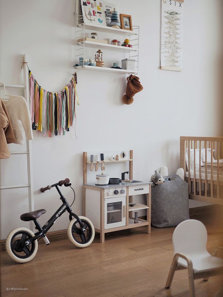 △ 儿童房,我们主张不做任何固定家具(当然,这也是因为房子本身面积足够)。来应对 UU 成长过程中的各个状态。 从起初的空无一物,到有了海洋球池,有了帐篷,有了滑滑梯和秋千……都是在成长不同时期,开始能驾驭的玩具。