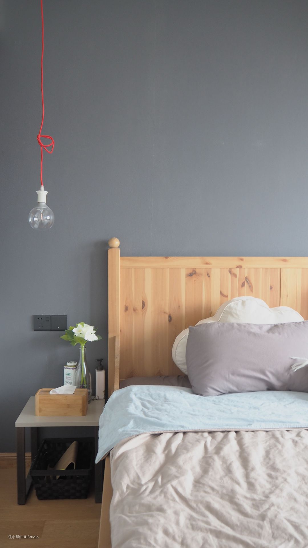 △ 2015 年的时候,买了「IKEA」红色床头柜搭配红色线绳裸灯泡吊灯相呼应。