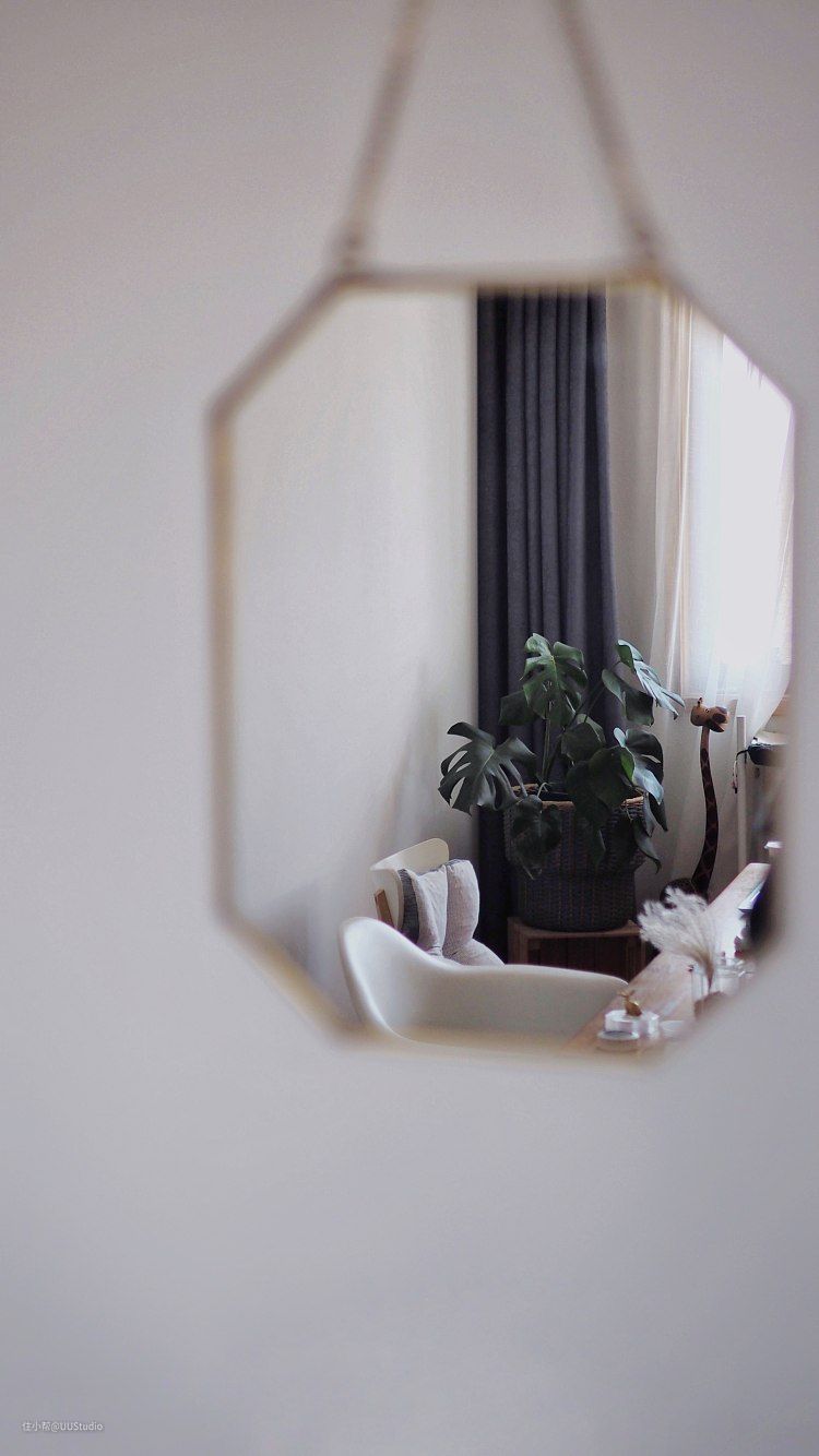 △ 从厨房移门的全身镜中映射出的玄关。芍药换了雾中情人,花瓶换成「舒梵」的花器。