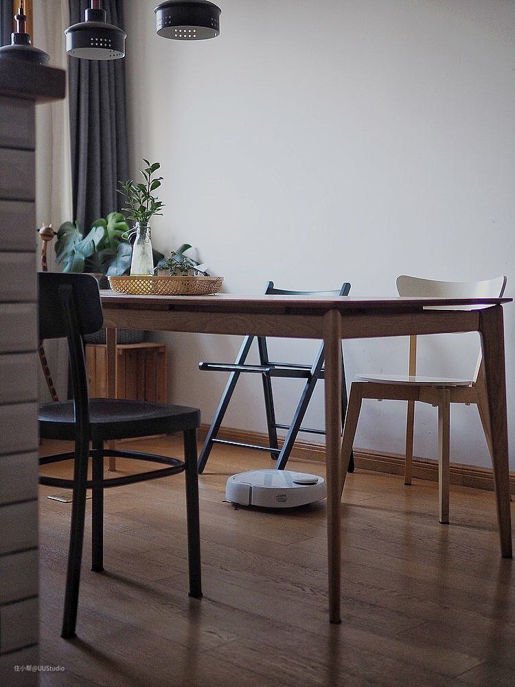 △ 床头柜换成了「IKEA」“格拉登 托盘桌”。细腿造型更显通透,唯一的问题是扫拖一体机进不去,只能绕圈打转转。