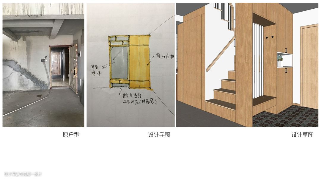 原户型楼梯位置在进门右手边,与入户门互相干扰,设计将楼梯调了个方向,彻底解决动线问题。楼梯底下也多了个储藏间。