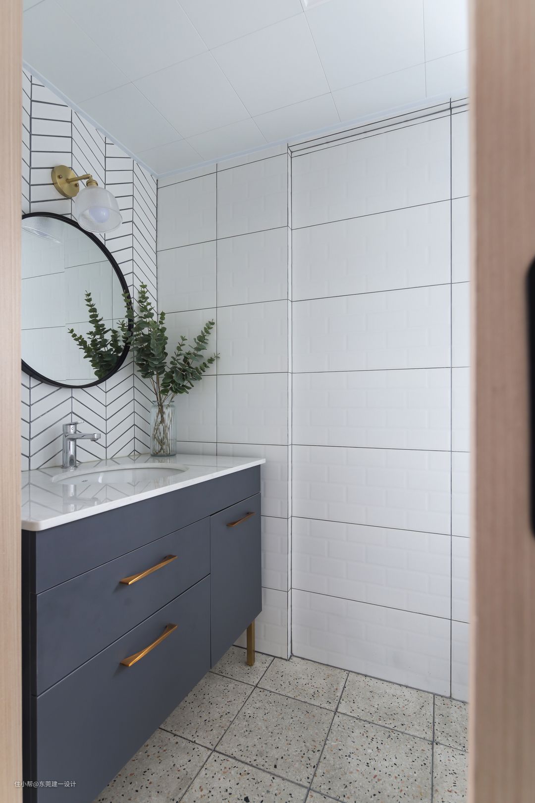 卫生间地砖是淘宝的水磨石地砖,墙砖也是网购的300*600带格子小砖。比起小面包砖,性价比极高。深蓝色的洗手台搭配黑色细框圆镜,古铜色的小壁灯,妥妥的经典北欧感