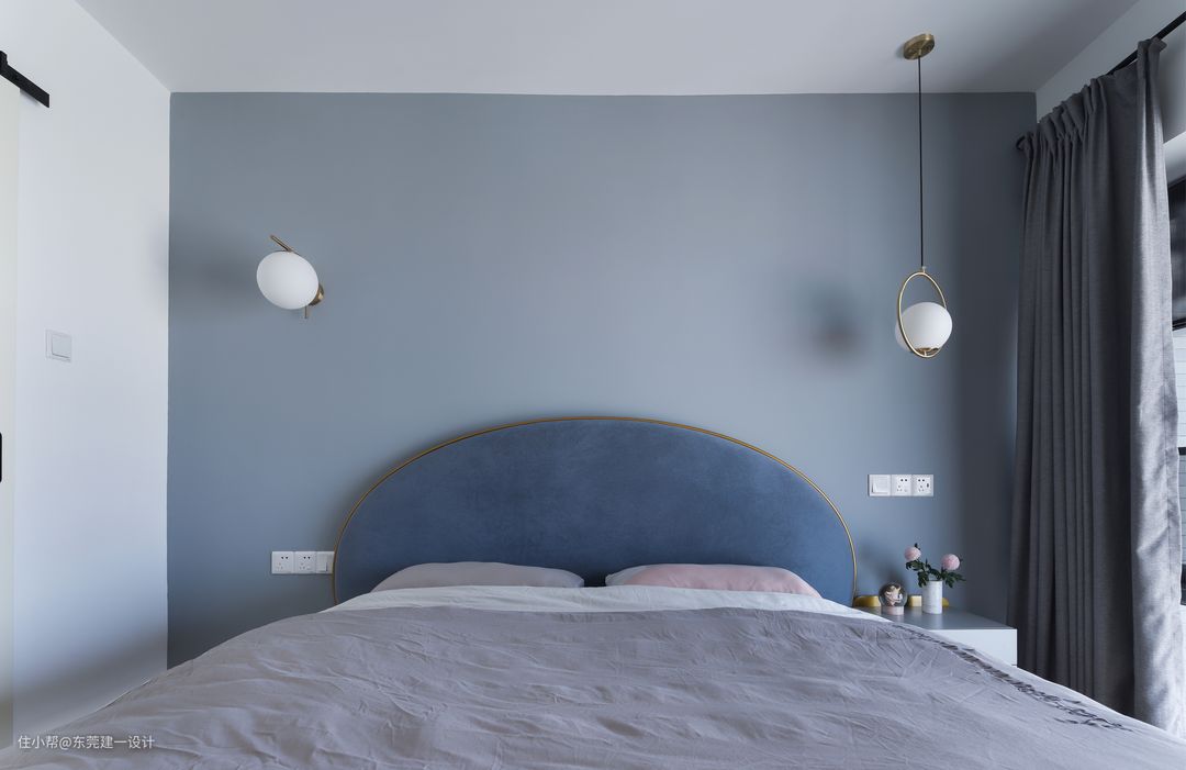 主卧室床头选用马卡龙灰蓝色系,静谧而清爽,搭配深蓝色半月形古铜边1.8米大床,轻松营造童话般的卧室空间。
