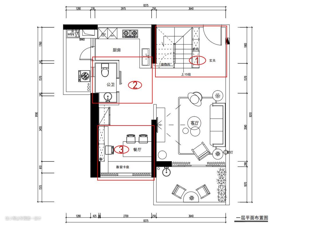 一层原户型结构痛点: 1,楼梯位置比较尴尬,入户动线与楼梯上二层动线重合,互相干扰;没有玄关位置;餐厅位置也偏小。 2,一层卫生间与厨房位置重合,且厨房面积偏小