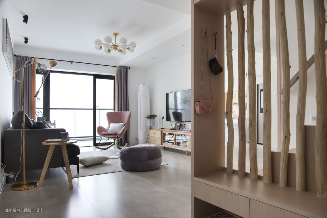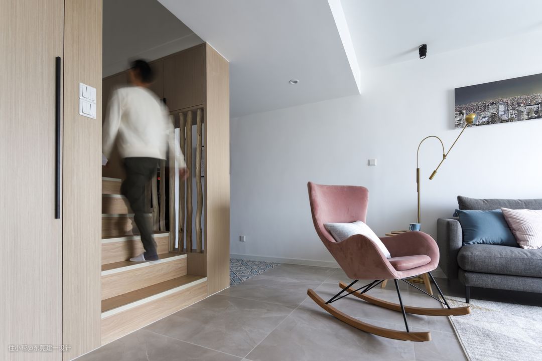 客厅区域没有做过多的装饰,地面选用柔光砖,易清洁,脚感也很舒适。家具的选配也是希望营造舒适慵懒的感觉。灰粉色的摇椅立马让空间亮起来。