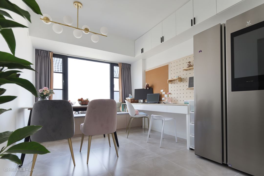 改造后的餐厅区域非常的宽敞,考虑到屋主有在家办公的时候,在餐区设置工作台。餐厅和书房共享,空间利用率更强。谁说餐厅就只是吃饭的地方,其他时候也是很棒的工作台,以后还可以是小朋友的书桌。厨房,书桌,餐桌,三点一线;一家人都可以很好的互动。