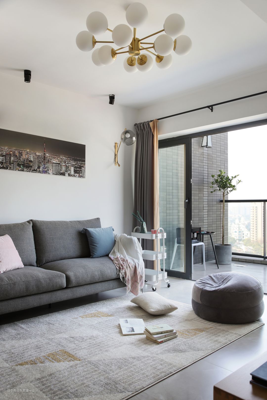 沙发后面的装饰画,是屋主的摄影作品定制而成,非常有意义。沙发侧面设置小推车,非常的方便,可以收纳小零食,书报等等。