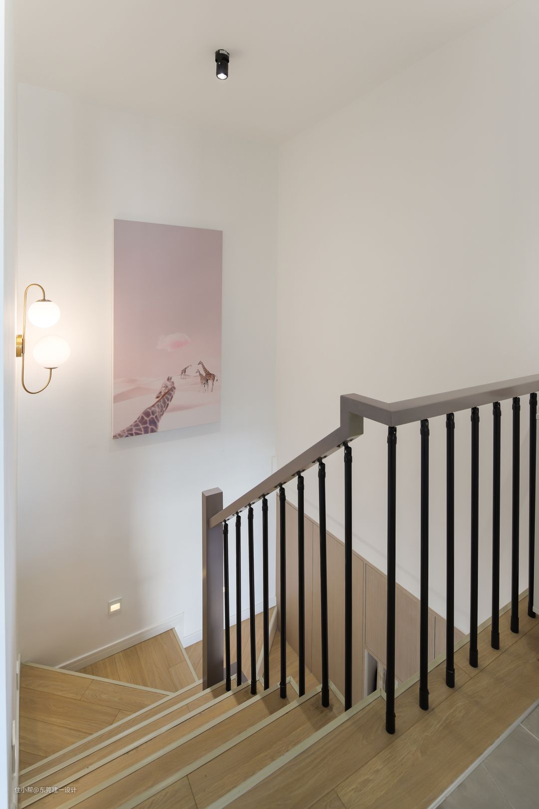 转角处特意选了一幅粉色系长颈鹿挂画 搭配古铜色壁灯
